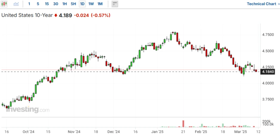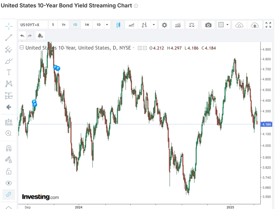 트럼프는 미국의 국가부채와 재정 상황 때문에 10년물 국채금리가 낮아지길 원하고 있다. 미국 정부는 지속적인 재정 적자로 인해 상당한 규모의 국채를 발행하고 있으며, 높은 국채금리는 채무 상환 부담을 증가시키기 때문이다. (미국의 부채 규모는 한국이 GDP 대비 55% 수준이면 미국은 122% 수준) 특히, 향후 몇 년간 대규모 채무를 차환해야 하는 상황에서, 국채금리 수준은 재정에 직접적인 영향을 준다. 신규로 발행되는 국채 금리가 낮아지기 위해서는, 국채 유통금리가 낮아져야 한다. 투자자들은 기존 유통 국채의 시장 금리를 참고하여 경매로 입찰하기 때문이다. 10년물 국채금리 수준이 지금처럼 높다면, 조달 비용도 올라갈 수밖에 없다. 더불어, 연준의 정책금리 인하도 필요하다.
