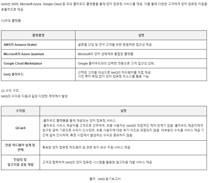 수익 구조 : IonQ는 양자 컴퓨터 판매, 클라우드 기반 양자 컴퓨팅 서비스 제공, 연구 계약 등을 통해 수익을 창출. 특히, 클라우드 플랫폼을 통한 서비스 제공은 다양한 산업 분야의 고객들에게 접근성을 높이고 있음.