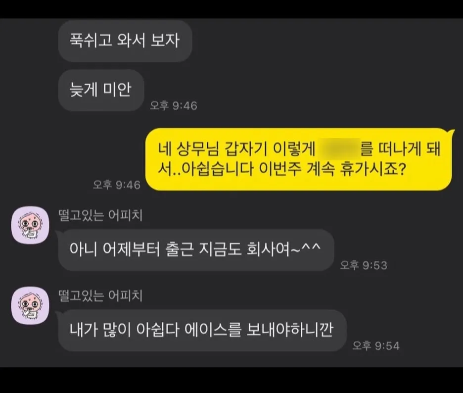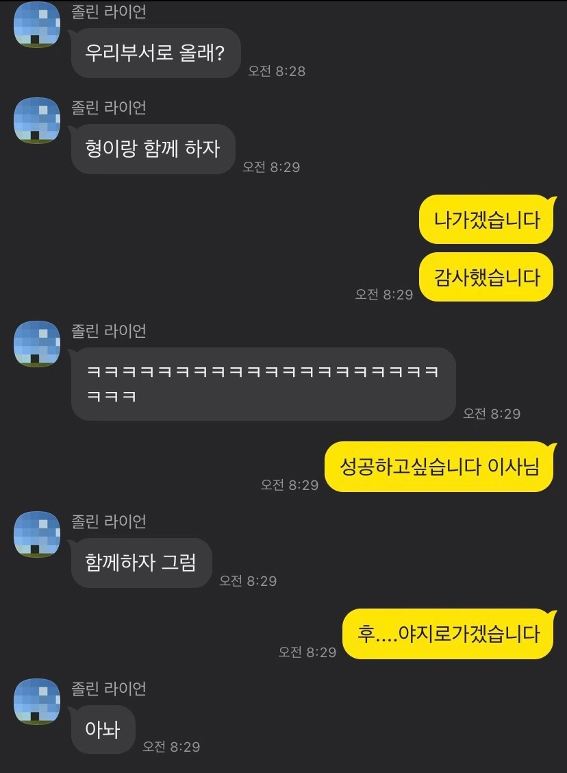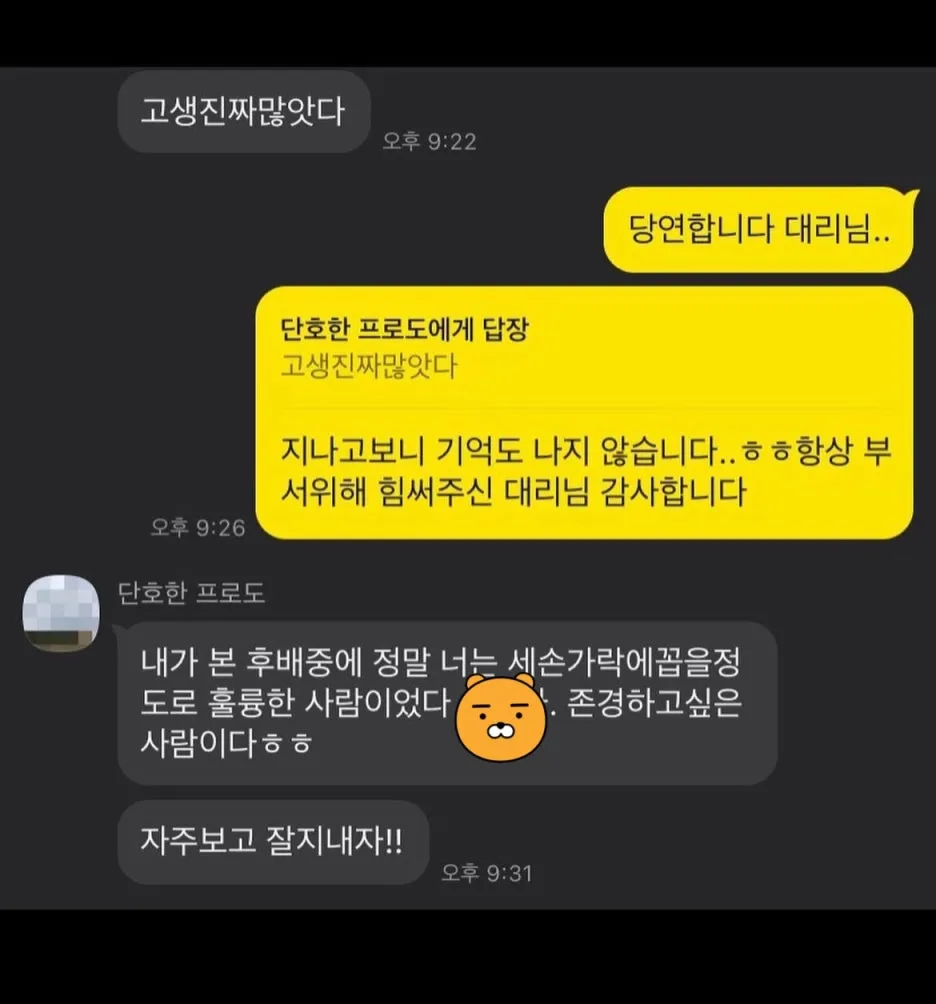 5년.. 5년.. 기성세대분들은 한 직장에서 평생을 근무하시던 분들도 많기에, 5년은 짧은 편이다. 그럼에도 특정 산업을 꽤나 깊이 있게 파고들고 그 사이 희로애락을 느끼기에는 충분한 시간이기도 하다. 힘들 때도 많았다. 높은 업무 강도로 악몽을 꿀정도로 스트레스가 심했던 시기도 있었고, 업 특성상 교활하고 비열한 적군/아군인척 하는 적군들을 상대하며 내상도 많이 입었다. 그럼에도 이 관계를 지금까지 끌고 온 것은, 전적으로 일이 적성에 맞았기 때문이다. 직장인들 사이에서 '자기가 하는 일이 잘 맞다'라고 이야기하는 것이 얼마나 담대한 발언인가. 다행히도 나는, 일이 적성에 맞았기에 재미를 느꼈고, 몰입하게 되니, 나름 또 너무 못나지 않은 사람이 됐다. 물론, 겉보기에는 우두한 일꾼 혹은 착실한 노예였을지도 모르겠지만, 스스로 만족하며 살았다. 더불어, 존경할만하고 배울 수 있는 선후배들과 함께였기에 또 많은 배움과 성장이 있었다. 또 그들로부터 격려와 인정을 받으며 회사생활을 했다는 것에 내심 혼자만의 자부심을 갖고 있다. 아래는 직장생활을 하며 부서를 옮기고 이직을 할 때 주고받은 대화들이다.