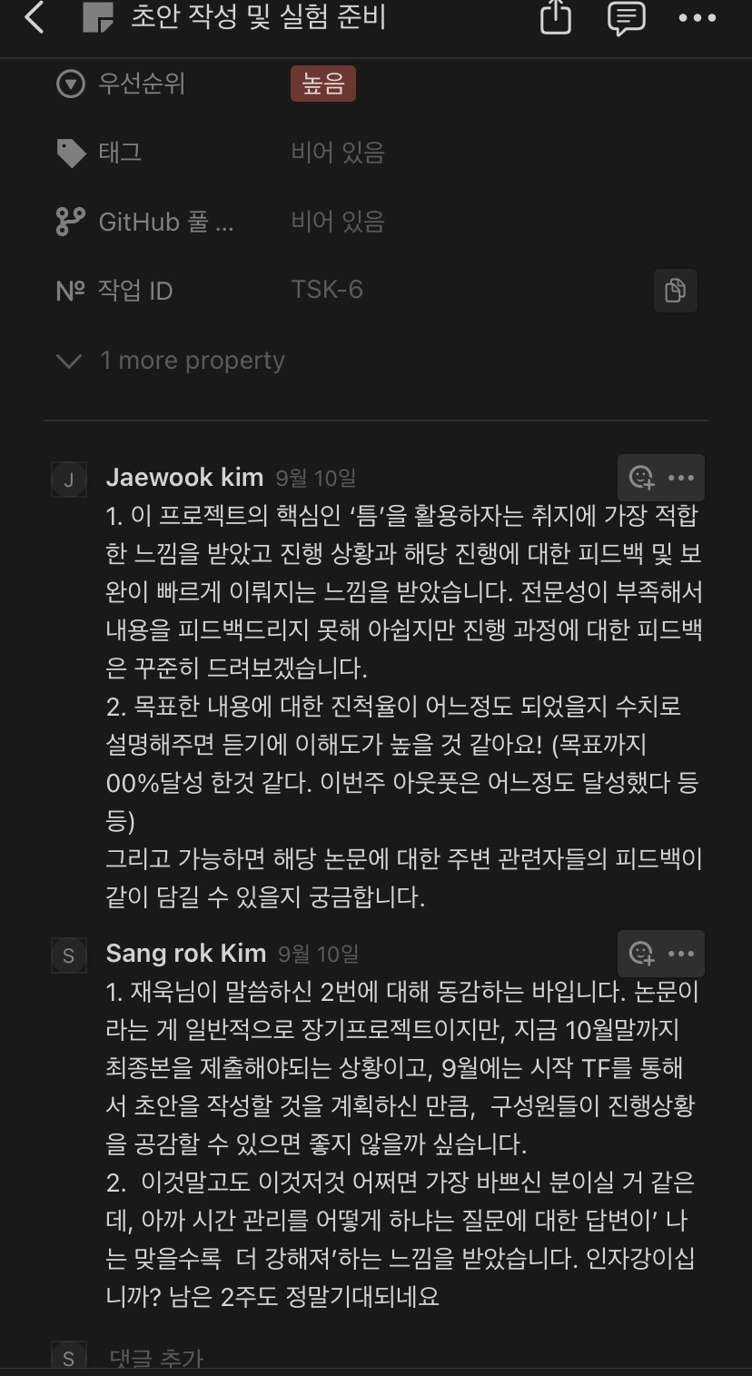 -시작 TF활용 : 모임 활동을 하면서 타인의 시선과 제한적인 시간에 정해진 목표, 기대에 부응해야 된다라는 압박/책임감이, 목표를 달성하는데 주요한 동력으로 작용하였고, 논문 제출을 위한 초안 작성 완료