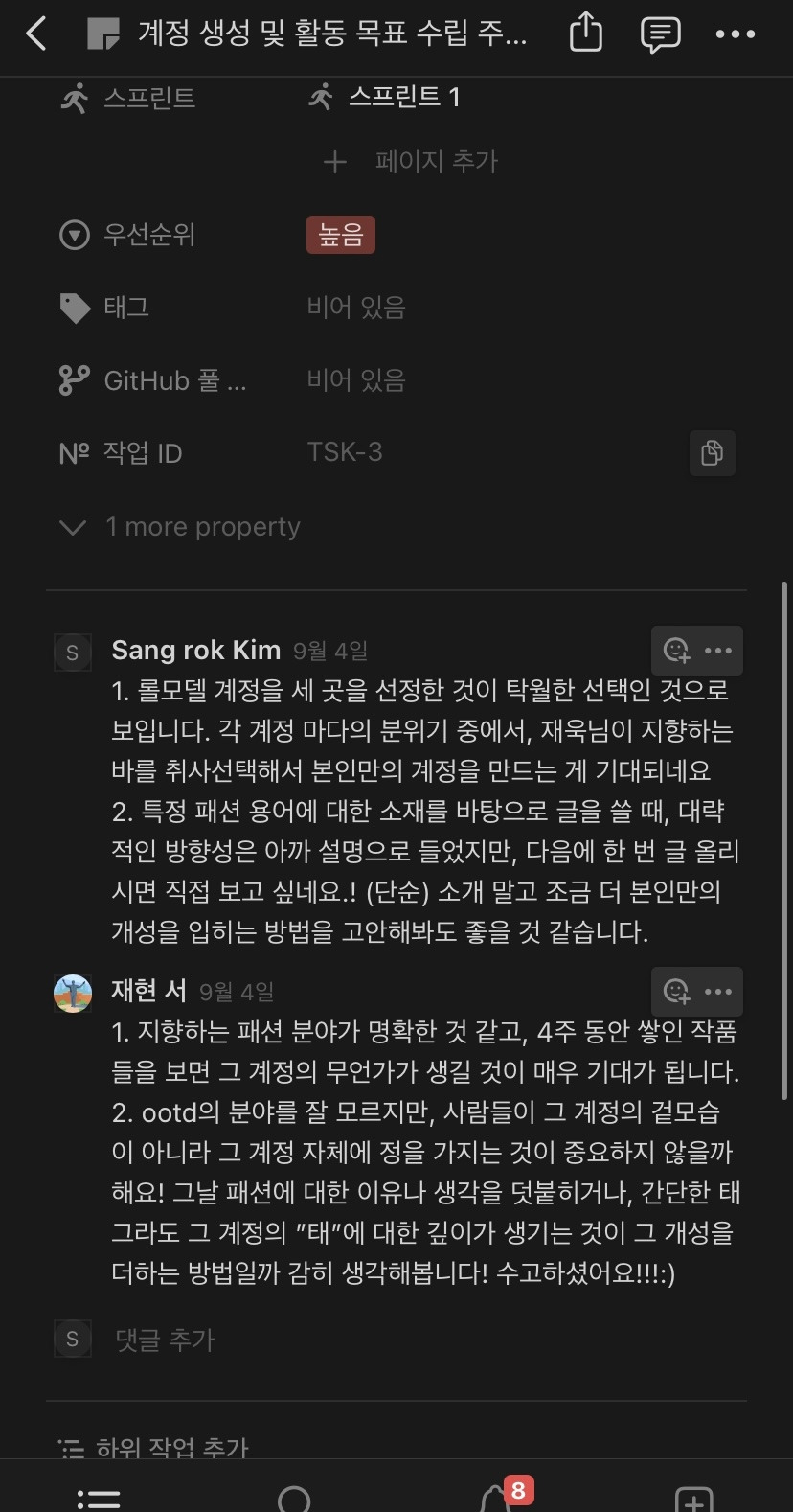 -혼자서 모든 것들을 최대한 처리할 것이지만, 타인과 대화를 나누며 고민이 필요한 부분도 있다. 같이 운영할 1명도 연내 영입할 것이다.(살짝 외롭고 신경 쓸 게 많음)