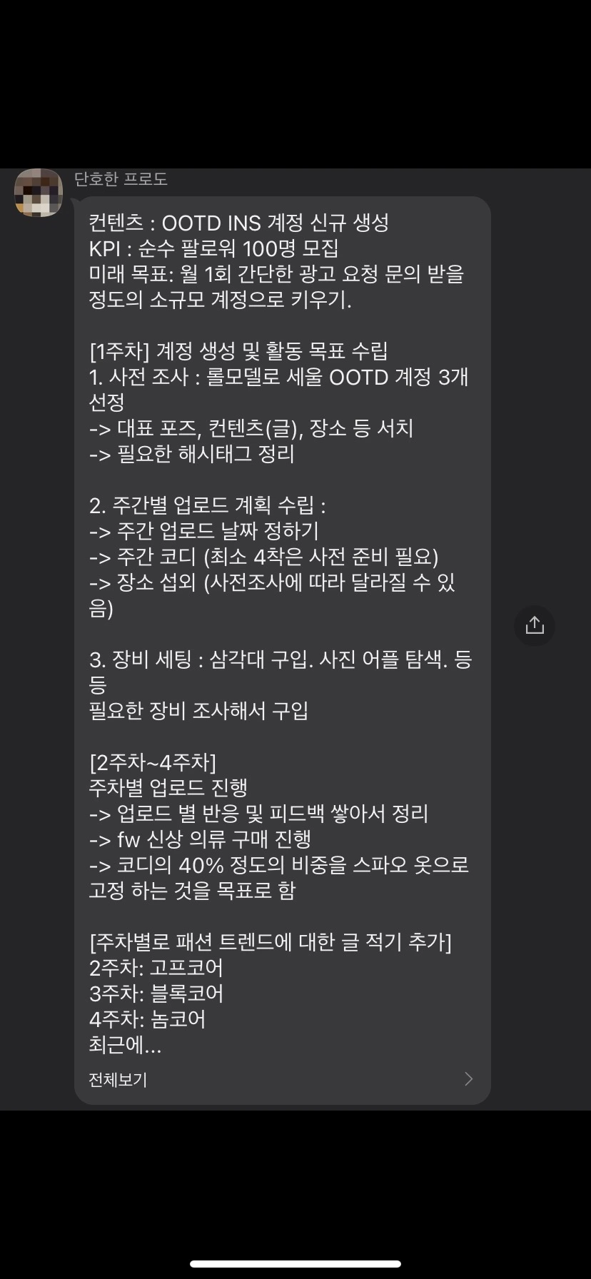 -목표 요약 : 인스타계정 개설하고, 매주 3회 이상 OOTD 업로드를 위해, 사전에 롤모델 설정. 촬영장비 구매, 패션 트렌드에 관한 글 적기.