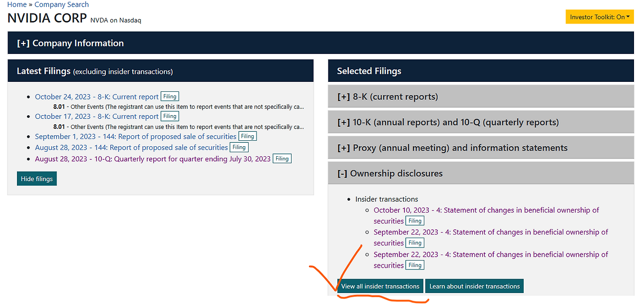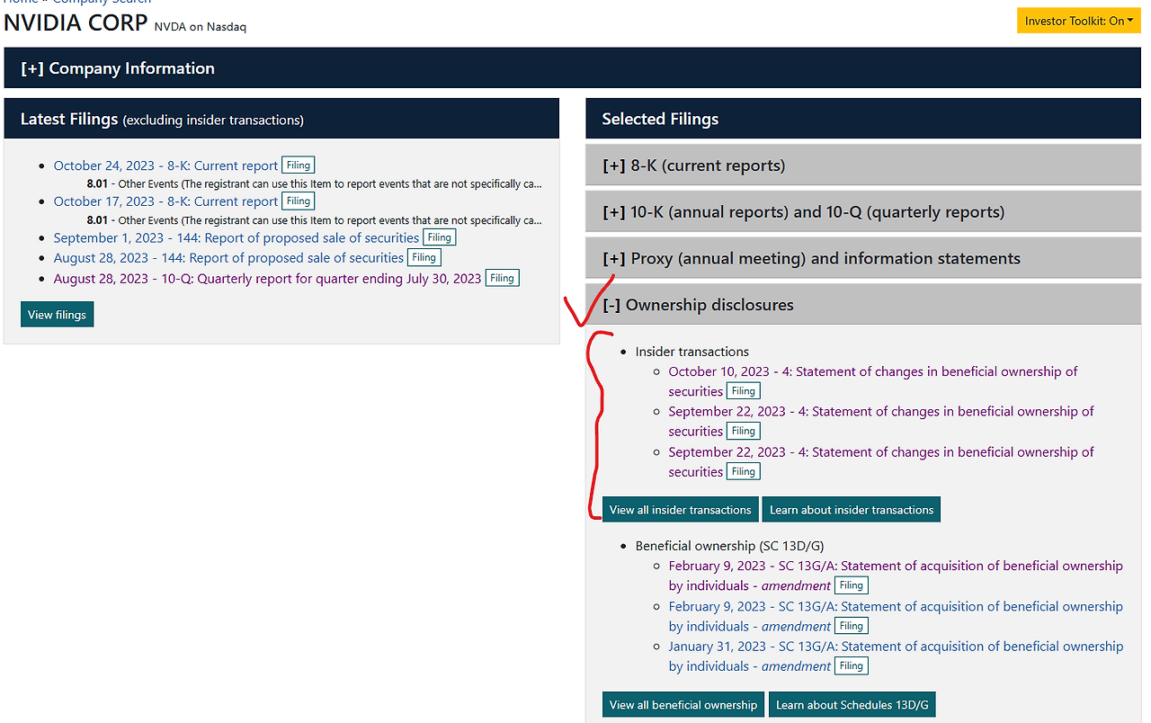 투자 전에 투자자들은, 내가 관심 있는 회사의 주가가 좋아질까?라고 고민할 때, 그 회사의 내부자들의 지분율을 함께 고려할 수 있습니다. 왜냐하면 많은 투자자들이 그 회사의 내부자가 회사의 주식을 매수하거나 매도하는 것이 알려지면, 회사의 성과나 전망에 대한 내부자의 관점을 간접적으로 드러낸다고 믿기 때문입니다. 물론 내부자들은 유동성 및 다양성 목적으로 포함하여 여러 가지 이유로 회사 증권을 매도할 수 있습니다. 따라서 SEC의 EDGAR에 공시된 Insider transactions의 Forms 3, 4 및 5를 통해 관련 내용을 확인할 수 있습니다.