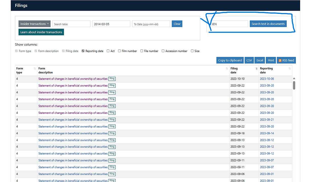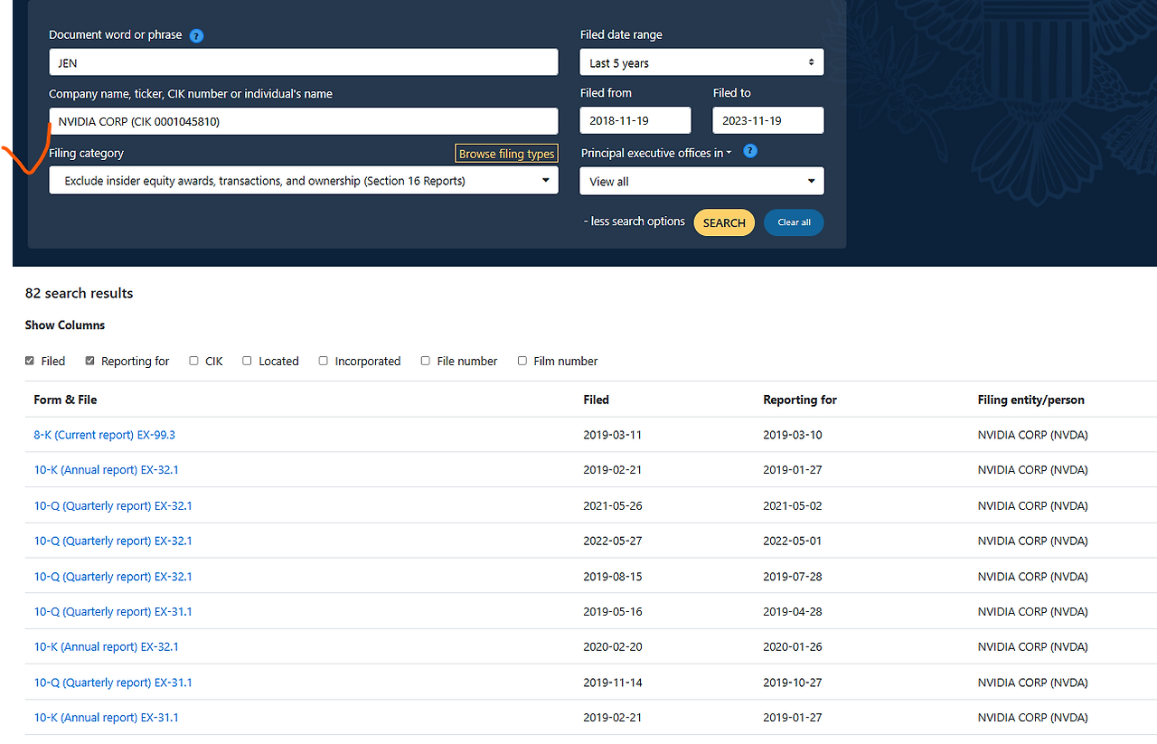 우선, 아래처럼 STATEMENT OF CHANGES IN BENEFICIAL OWNERSHIP라고만 명시되어 있으면 보기가 불편하니까, 젠슨황의 매매 내역만을 검색하기 위해, 아래처럼 'Search text in documents'에서 HUANG JEN HUSN에서 JEN으로만 일단 검색을 해보겠습니다.