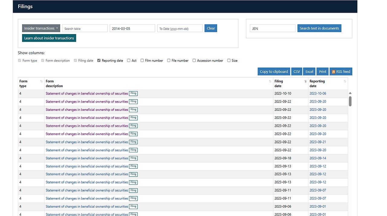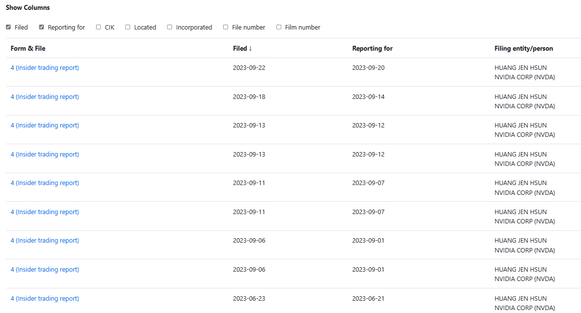 그럼 이제 젠슨황의 Form4에 따른 매매일자와 제출일자들을 확인할 수 있게 됩니다.