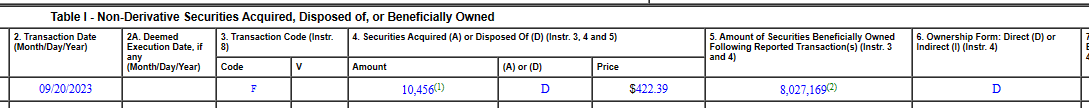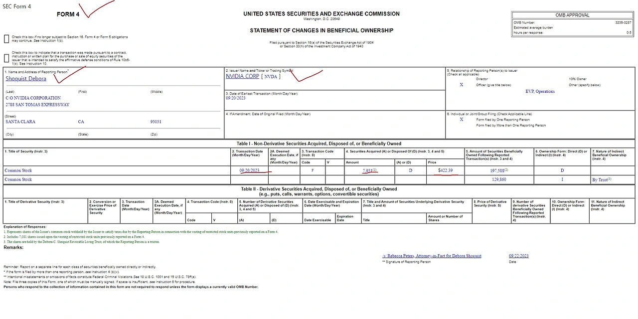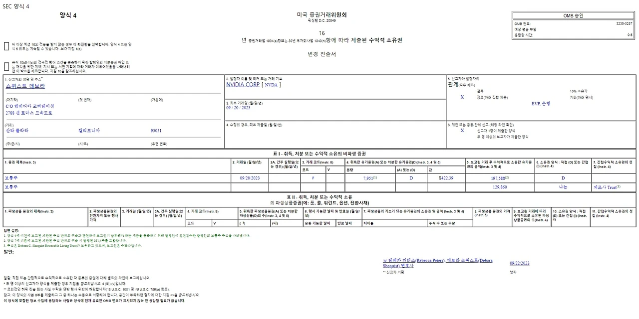 아래 캡쳐본을 참고하시면, 빼곡하게 정보가 많은데 체크 표시만 보면 Form 4 양식으로, Shoquist Debora라는 임직원 분께서 엔비디아의 주식을 2023년 9월 20일에 7,951주를 $422.39 가격에 처분한 것을 알 수 있습니다. 약 335만 달러, 당시 환율(1,330원) 기준으로 대략 45억 원 규모의 주식이네요