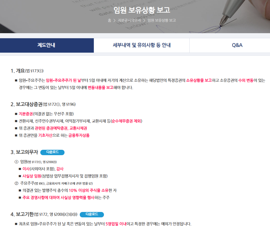 참고로, 국내에 상장된 회사들의 경우, Dart(전자공시시스템 (fss.or.kr)) 에서 임원보유상황보고를 통해 주식 보유 현황에 대해 공시의무를 두고 있습니다. 세부 내용(기업공시 길라잡이 (fss.or.kr))은 아래와 같으니 참고해 주세요
