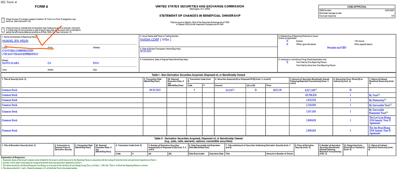 아니, 근데 전부 STATEMENT OF CHANGES IN BENEFICIAL OWNERSHIP 이라고만 명시되어 있고 누가 냈는지 확인을 어떻게 하는 걸까요. 저는 엔비디아의 CEO인 젠슨황의 매매내역을 확인하고 싶은데요. 9/22에 Filing 된 서류가 총 7개인데, 일일히 클릭해보니 상단 캡처화면 기준 위에서 5번째 서류가, 아래와 같이 CEO의 9/20 매매내역을 확인할 수 있습니다.