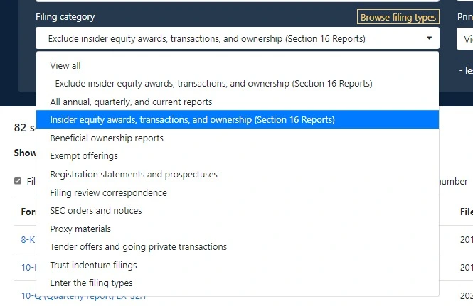 그럼, 아래처럼 나옵니다. 8-K, 10-K, 10-Q 등 이전 시간에 알아본 반가운 공시서류들도 나오지만, 저희가 지금 필요한 정보는 Insider transactions이다 보니, Filing category를 들어가 봅니다.