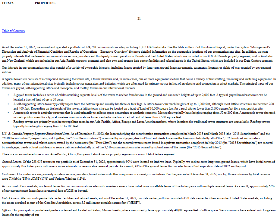 결국 산업과 회사의 특성에 따라, 10-K 목차에서 가중치가 다를 수 있다는 것입니다. 이를테면 미국의 최대 통신 인프라 리츠(REITs)인 아메리칸 타워(AMT)의 경우, 산업의 특성상 Properties에 대한 부분이 엔비디아는 당연히 기술할 부분이 많겠죠? 아래 두 회사의 Properties에 대한 내용의 길이만 봐도 알 수 있습니다.