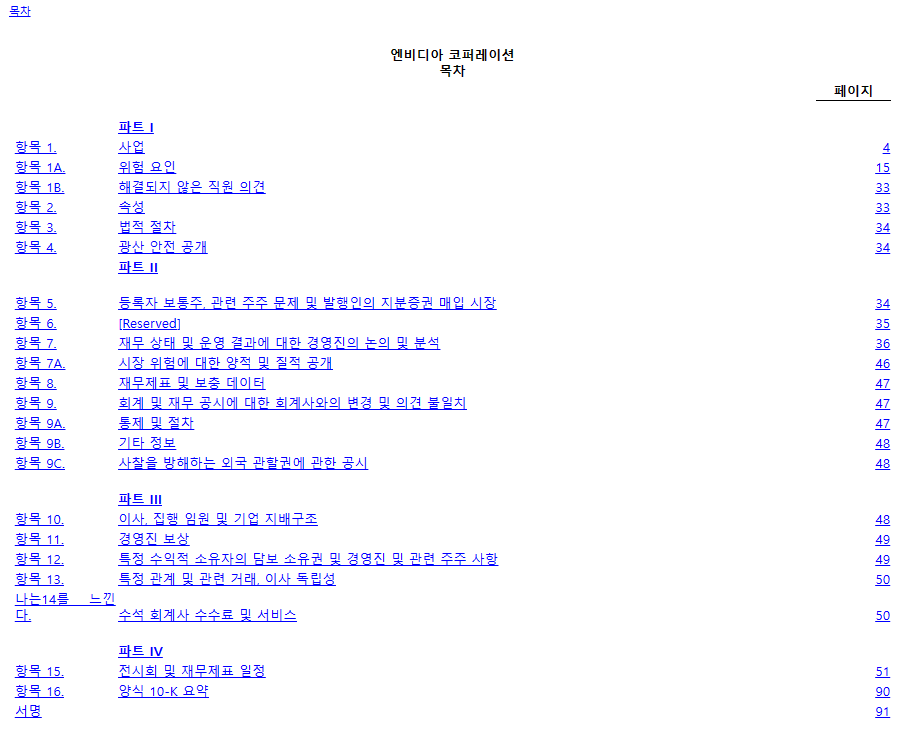 저 그럼 이제 본격적으로 다시 10-K보고서를 목차를 살펴보겠습니다. 이번에도 엔비디아(NVDA)입니다.