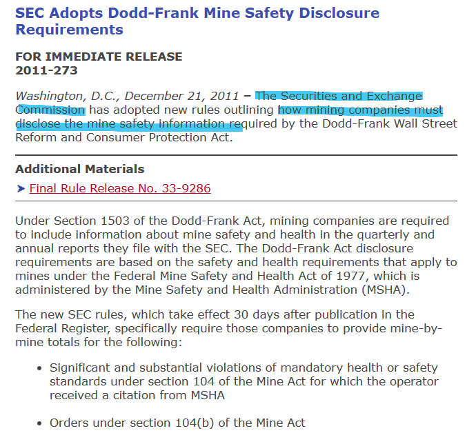 아무튼 이 Dodd-Frank Act는 Financial stability를 비롯한 굉장히 방대한 양의 section을 담고 있습니다.( sec.1부터 ~ sec 1506) 근데 이중 sec 1503에 'Reporting requirements regarding coal or other mine safety.'라는 게 있고, SEC에서 2011년부터 관련 내용을 광산회사들이 공시할 것을 채택하였습니다.