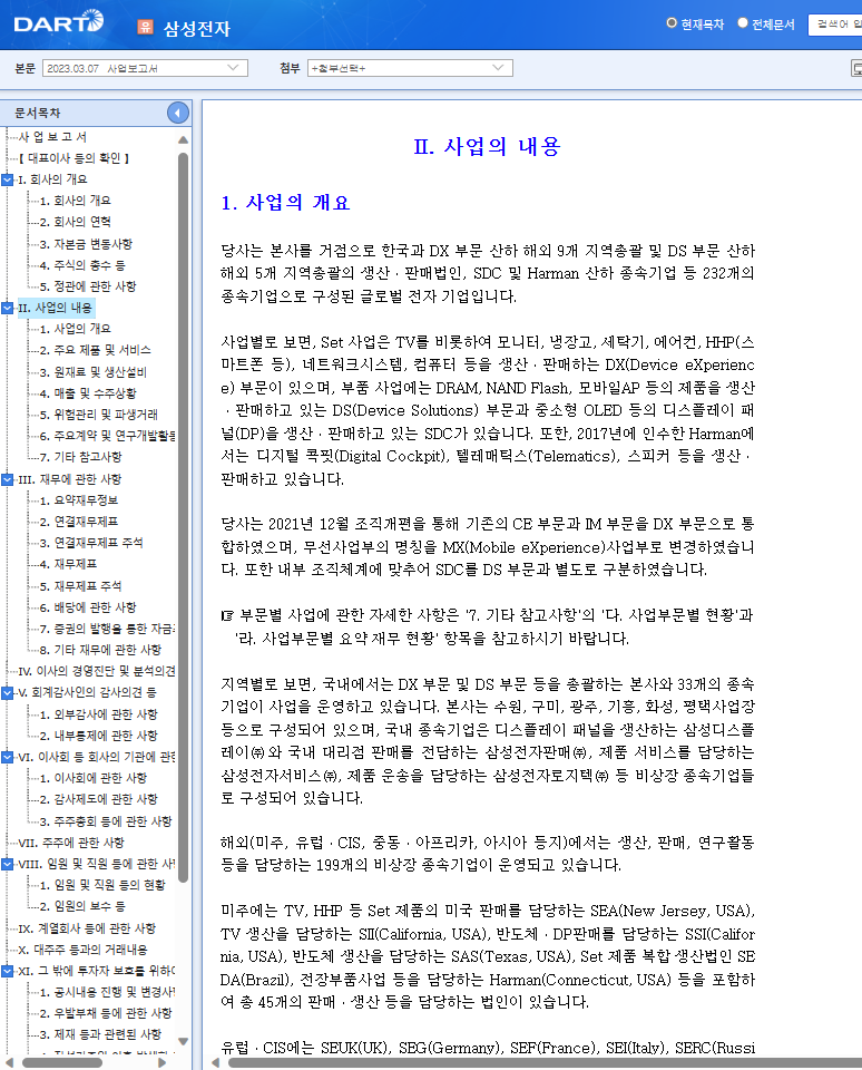 제가 미국의 10-K 보고서를 읽어보고 받은 인상은, 한편으로는 내용의 질이 좋다고 느끼면서도, 다른 한편으로는 내용을 전달하는 방식, 이를테면 표나 그래프 등이 적극적으로 활용되어 있지는 않다는 것이었습니다. 거의 줄글로만 내용이 구성되어 있기도 하고, 또 한국의 사업보고서는 아래 캡처처럼, 내가 어느 부분에 있던 목차를 좌측에서 볼 수 있는 게 편리한 반면,