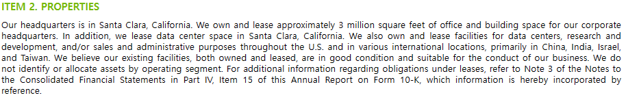 회사가 소유한 부동산(자산)에 관련된 내용으로, 엔비디아 본사의 위치 그리고 어떤 부동산을 소유하고 리스로 사용하고 있는지가 기술되어 있습니다. 엔비디아가 속한 산업의 특성상, 해당 부분에 대한 자세한 기술이 필요하지는 않을 것 같습니다. 아래 캡처한 내용을 봐도 한 문단이 전부입니다.