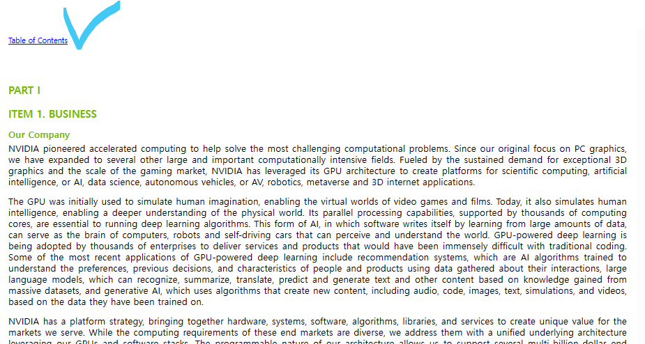 PartI의 Item1은 회사를 파악하는 근간이 되는 부분입니다. 그러니 10-K 보고서에도 목차의 서두에 배치하지 않았을까 싶네요. 엔비디아의 사업과 지금까지의 여정과 향후 비전 등 Item1로 가보면 내용이 굉장히 많습니다.