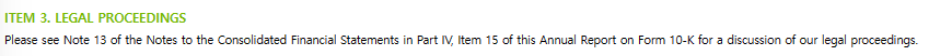 엔비디아가 직면한 중요한 법적 문제에 관한 정보를 기술하는 부분으로, 진행 중인 소송과 법적 분쟁을 비롯한 기타 법적 절차 등을 포함합니다. 소송이라는 것이 사업을 영위하다 보면 불가피하게 겪게 되는 것일 테지만, 소송의 경중에 따라 천문학적인 비용이 소요되거나 사업의 존폐를 결정지을 수 있을 정도로 지대한 영향을 줄 수 있기 때문에 투자자께서는 해당 부분에 대해 반드시 치밀하게 파악을 해야 됩니다. 아래 엔비디아의 내용을 보더라도, Part1의 해당 부분에 기술하지 않고, 재무제표 주석인 Note 13을 참고하라고 나와 있는데요.