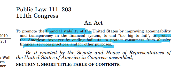 아래는 Dodd-Frank Act의 서론에 적혀 있는 문장입니다. 2008년도 미국의 서프프라임 모기지발 금융위기로 인해, 금융 시스템에 대한 신뢰성과 투명성을 제고시키고 일반 시민들의 세금으로 구제금융을 하는 등 오용되지 않기 위해 제정된 것으로 보입니다.