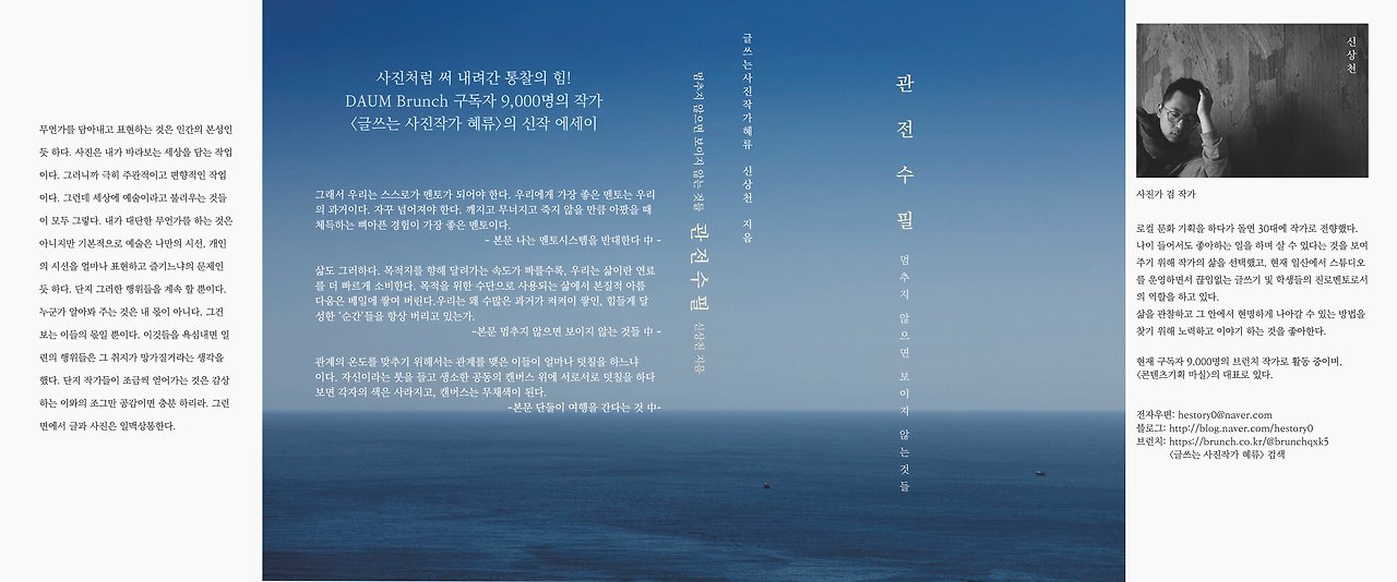 대신 부크크에서 책을 만들기 위해서는 작가가 편집과 교정 교열, 디자인을 모두 해야 한다. 기존의 원고를 바탕으로 부크크에서 주어지는 양식이 있는데 이에 맞춰 내부 디자인을 해야 함은 물론, 외부 디자인까지 직접 해야 한다. 본인이 디자인이 가능하다면 직접 할 수 있으며, 디자인이 불가할 때에는 디자이너에게 외주를 주는 방법이 있다. 어쨌건 모든 부분에 있어서 작가의 손이 간다는 것은 사실이다. 그래서 책은 더 소중해진다. 책의 한 땀 한 땀에 작가의 정성이 들어가 있다. 개인적으로 이번 책의 표지 디자인도 직접 진행을 했다. 나는 글과 함께 사진을 찍는 일을 하고 있으므로, 전에 개인작업을 했던 사진들을 바탕으로 심플하게 디자인을 했다.