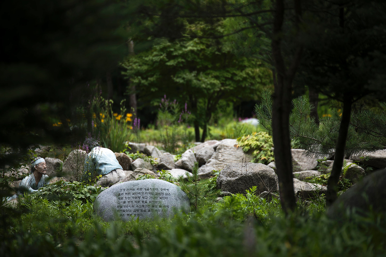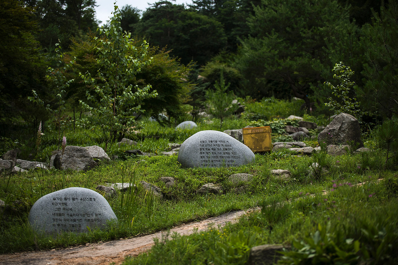곳곳에 소설의 흔적이 남아 있었다. 그러라고 만든 숲이겠지만 숲은 그의 정체성을 잃고 이미 소설을 체화하고 있었다. 순간 관람자 역시 소설 속으로 체화되는 듯했다. 숲에는 소설 속에 나오는 초가집들이 있었고, 풀숲을 헤치고 걸어가다 보면 소설의 일부분을 새긴 돌들을 만날 수 있었다.