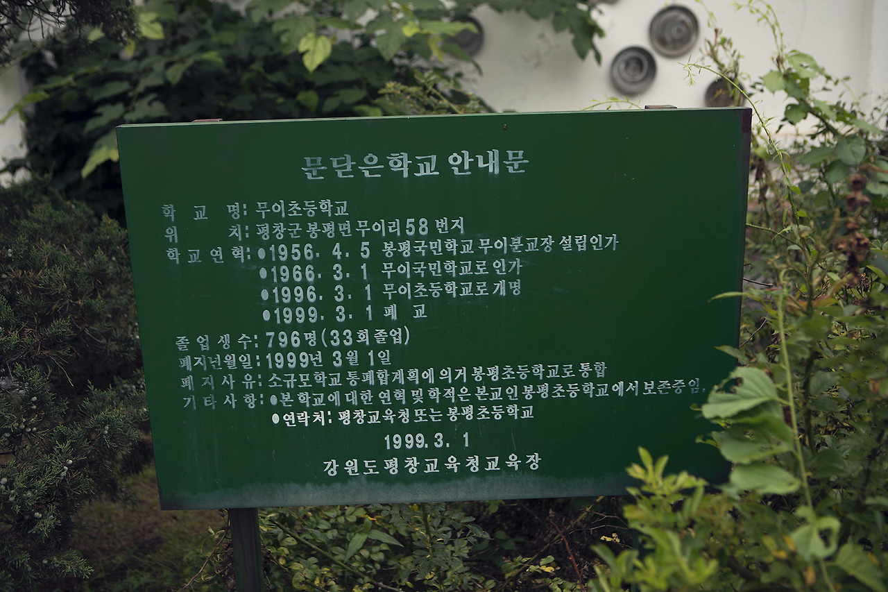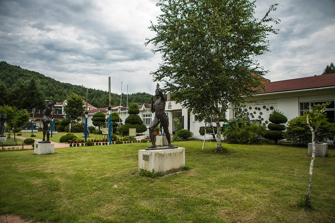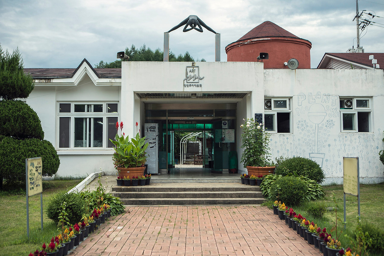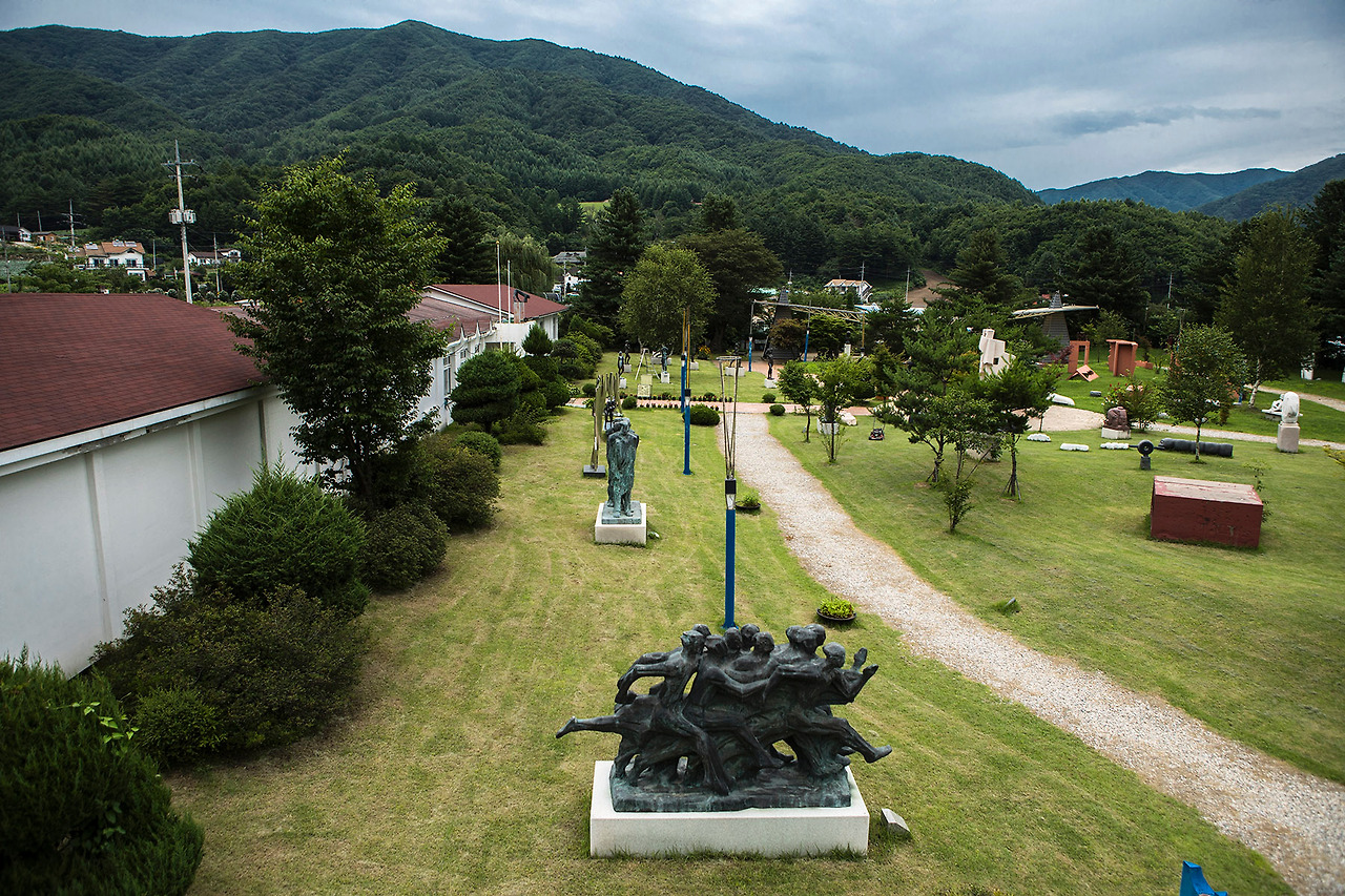 무이 예술관.. 평창 봉평면에 있는 작은 전시관이다. 1999년에 폐교한 '무이 초등학교'를 리모델링해서 만든 곳이다. 도착한 예술관의 외형은 학교의 흔적을 거의 찾아볼 수 없었다. 운동장은 잔디로 덮여 있었고 잔디 사이로 작가들의 조각품들이 서 있었다.