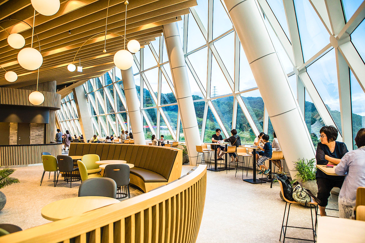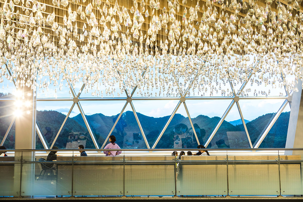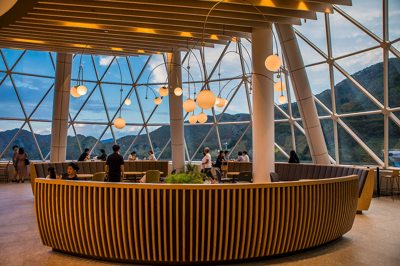 3층부터는 창으로 보이는 뷰가 말 그대로 장난이 아니었다. 이걸 볼려고 강원도를 왔던가라는 착각이 들 정도였다. 말 그대로 횡재였다. 로또는 못샀지만 스치듯 이렇게 아름다운 곳을 발견할 수 있다면 그게 삶의 소소한 로또가 아닐까. 사방이 유리로 둘러쌓여 있었다. 유리 아래로 앉을 수 있는 의자들이 소소하게 놓여져 있었다. 사람들은 앉아서 밖의 풍경을 감상하기도 하고 담소를 나누기도 했다. 이런 새로운 풍경을 보면 카메라를 든 이들은 신이 난다.