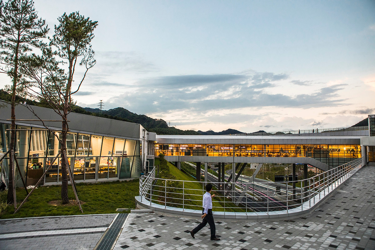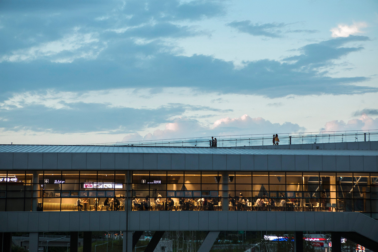 습지공원에서 올라오면 기하학적 모양의 휴게소 건물이 보인다. 휴게소 건물은 대략 3층 정도 되어 보이는데, 꼭대기에 사람들이 왔다갔다 하는 모습이 보였다. 올라가보고 싶었다. 계단을 찾았다. 저 곳에 올라가면 이곳의 경치가 전부 보일 거야.