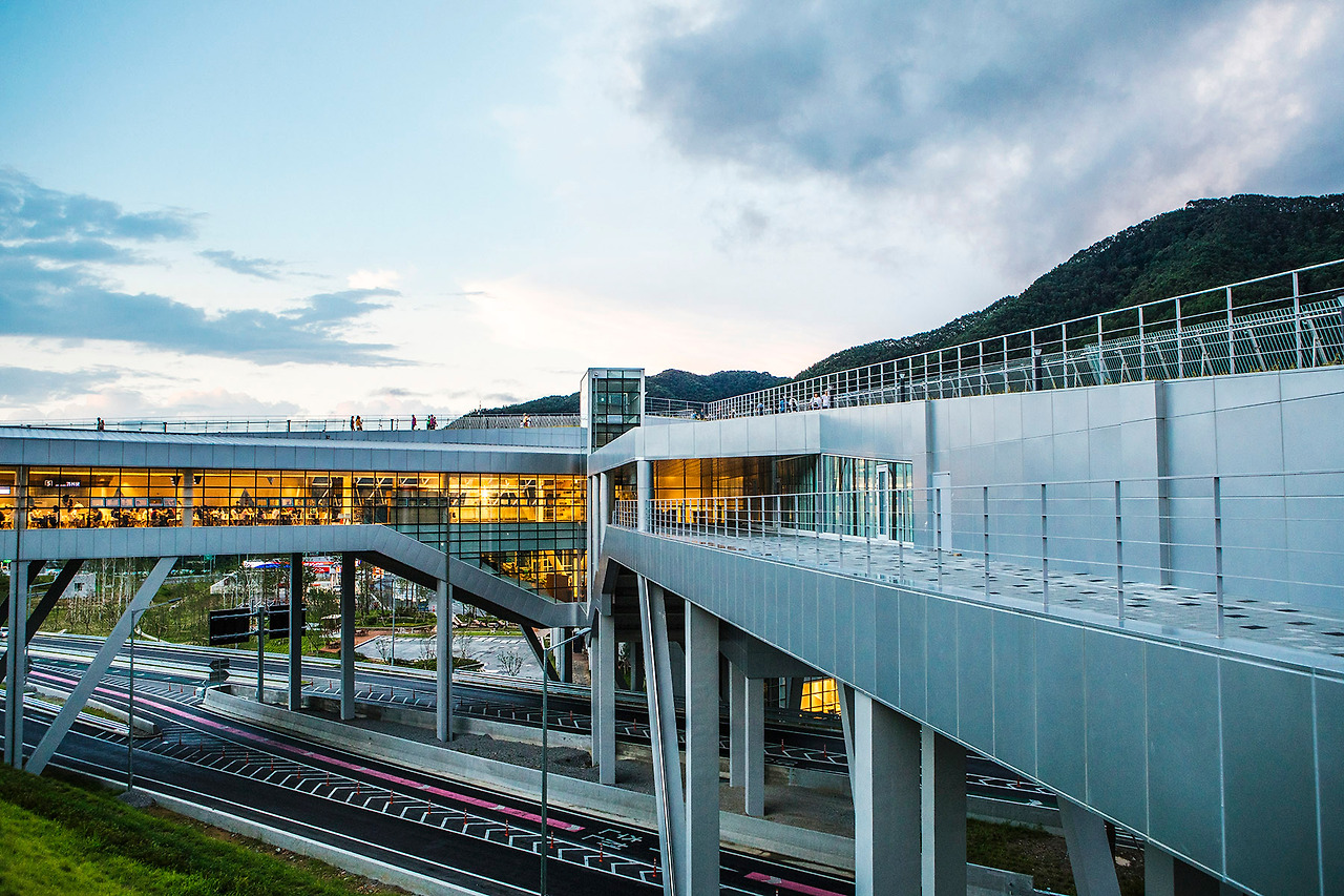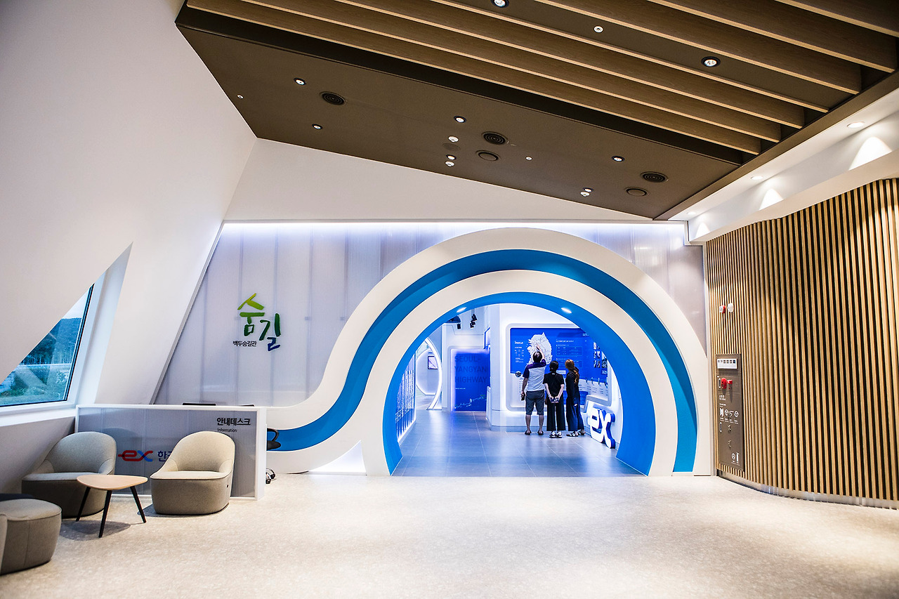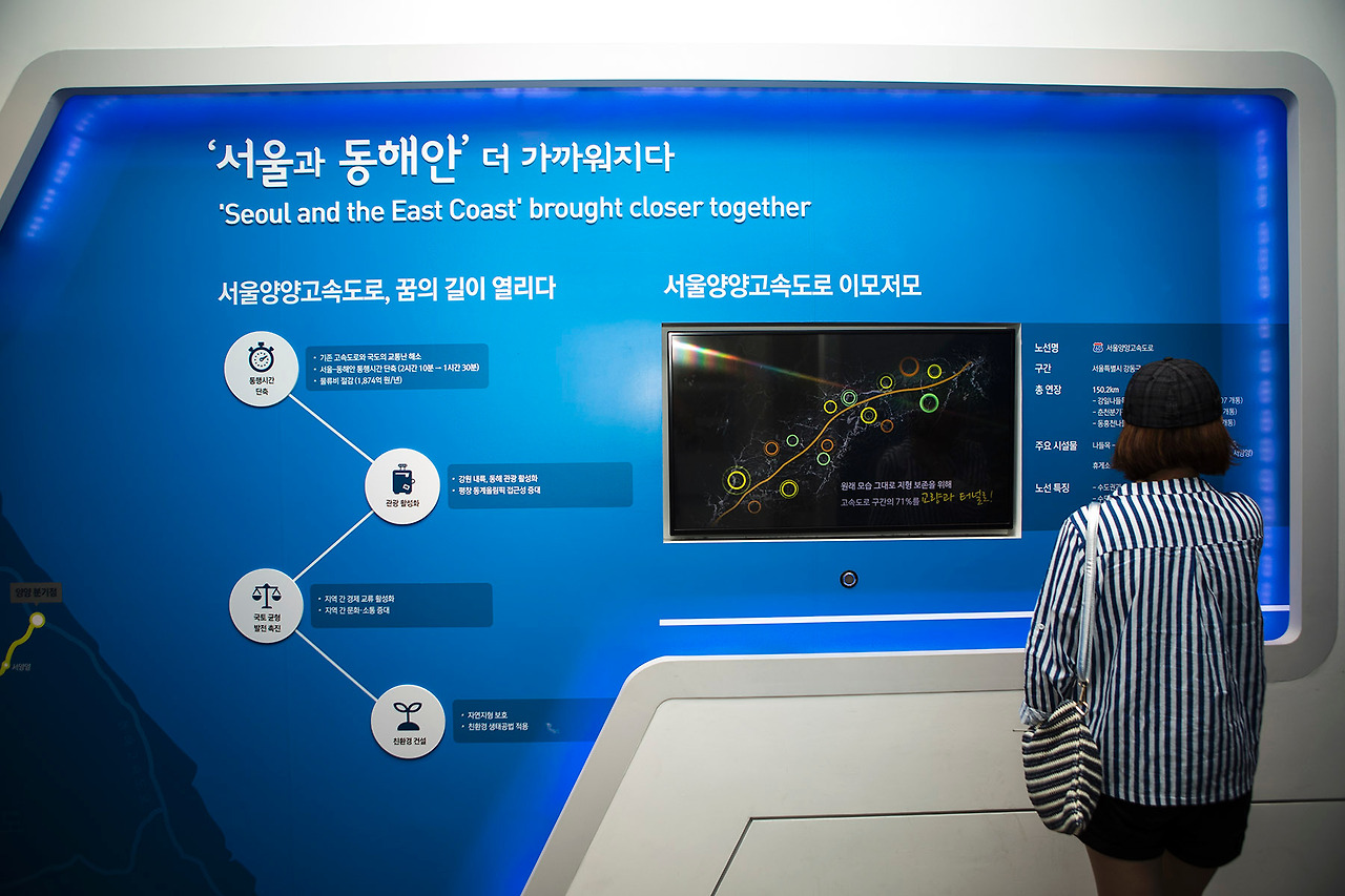 생애 최초로 휴게소 풍경을 열심히 담기 시작했다. 여기 참 멋지네. 이국적인 풍경들을 담다보니, ‘백두 숨길관’이라는 곳이 있었다. 안에는 양양고속도로에 대한 설명들이 있어 그간 몰랐던 사실들을 알 수 있었다. 새로운 고속도로가 이렇게 뚫리면 국내 여행을 자주 다니는 나 같은 이들은 즐겁다. 이동 거리가 단축될 여지가 많기 때문이고 다른 하나는 바로 신축 휴게소 때문이다. 보통 괜찮은 휴게소를 꼽으라면 덕평 자연휴게소나 행담도 휴게소등을 생각했다. 그런데 이번 내린천 휴게소의 경우 기존의 그것들과 형태나 레이아웃이 달라 꽤나 흥미로운 볼거리를 제공했다. 게다가 대한민국 최초 도로위에 지어진 상공형 휴게소라니. 이런 즐거운 볼거리가 있다면 국내여행의 여정도 그리 지루하지는 않을 것이다.