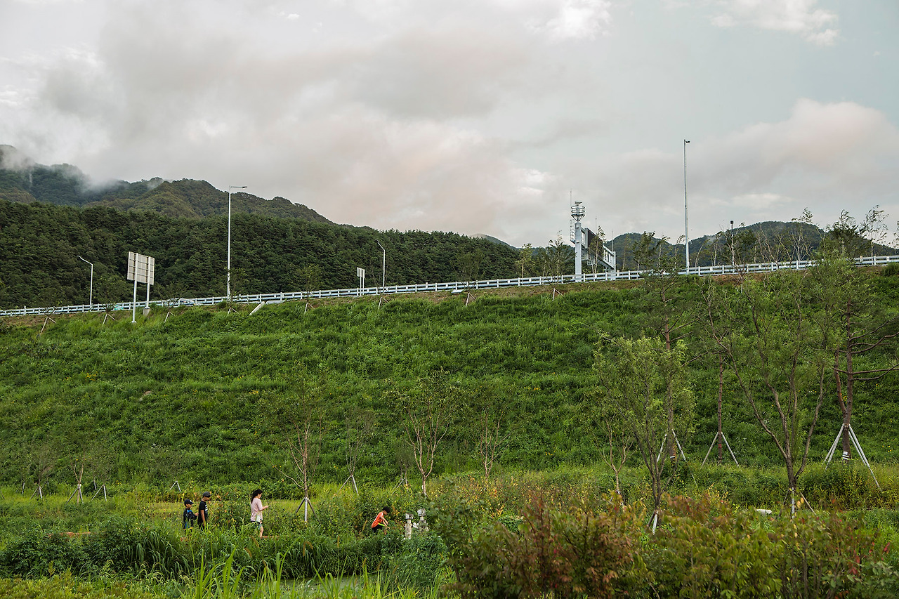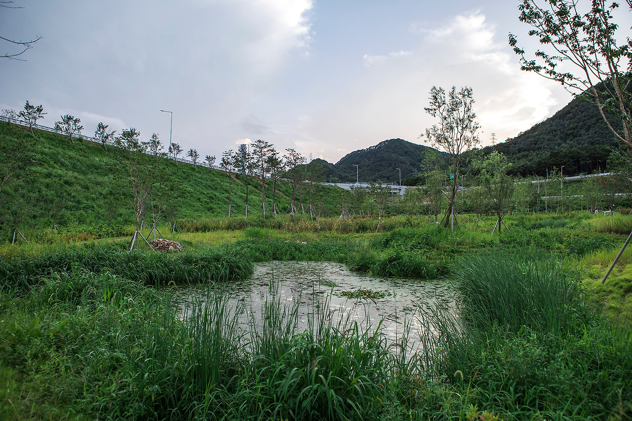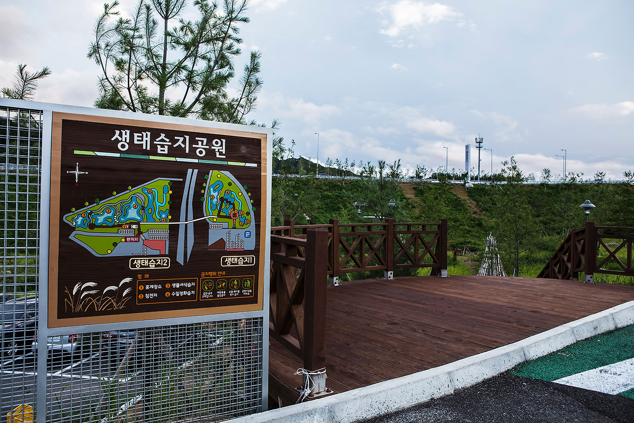 저녁 6시를 훌쩍 넘긴 시간이었는데에도 하늘은 블루톤을 띄고 있었다. 먹구름이 치고 있는 장막을 빼면 말이다. 잠시 쉬어갈 요량으로 차를 세웠다. 그런데 생각보다 휴게소가 매우 크다. 이번에 고속도로가 생기면서 만들어진 곳인 듯 했다. 일단 가장 먼저 눈에 띈 장소는 생태습지공원. 꽤나 넓은 부지를 차지 하고 있는 공원을 내려가니 공기부터 달랐다. 간단한 운동기구들도 있어 여행자들이 몸을 풀고 갈 수 있었다. 공기에서 차갑고도 신선한 느낌이 물씬 풍겨왔다. 매연을 뿜어대는 자동차 사이에서 공원은 청정지역이었다.