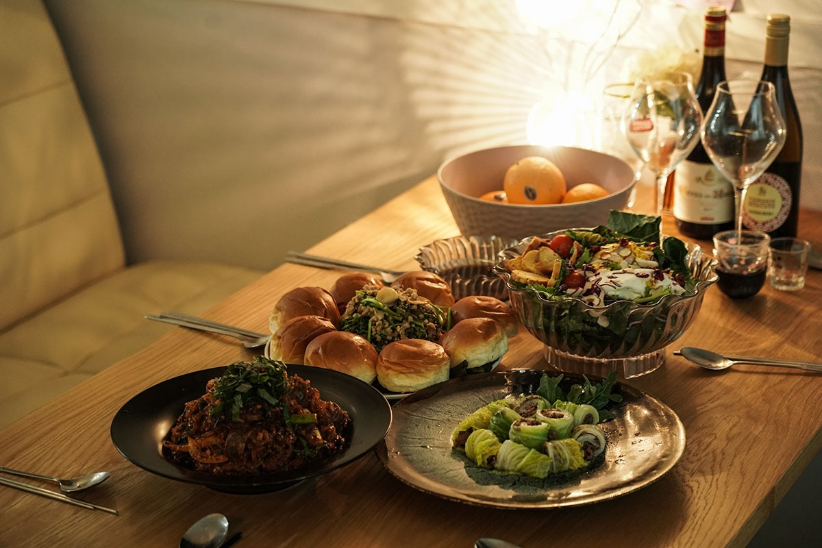 사람들은 '이게 다 뭐야'부터 '예쁘다', '새롭다'등의 반응들이 나왔다. 앉아서 젓가락을 들 때쯤 턴테이블에서 Jazz가 흘러나온다. 식사에 음악을 더하면 음식에 풍미를 더해줄 수 있다. 그리고 와인잔에는 스파클링 와인이 목 넘김의 소리를 내며 따라진다.