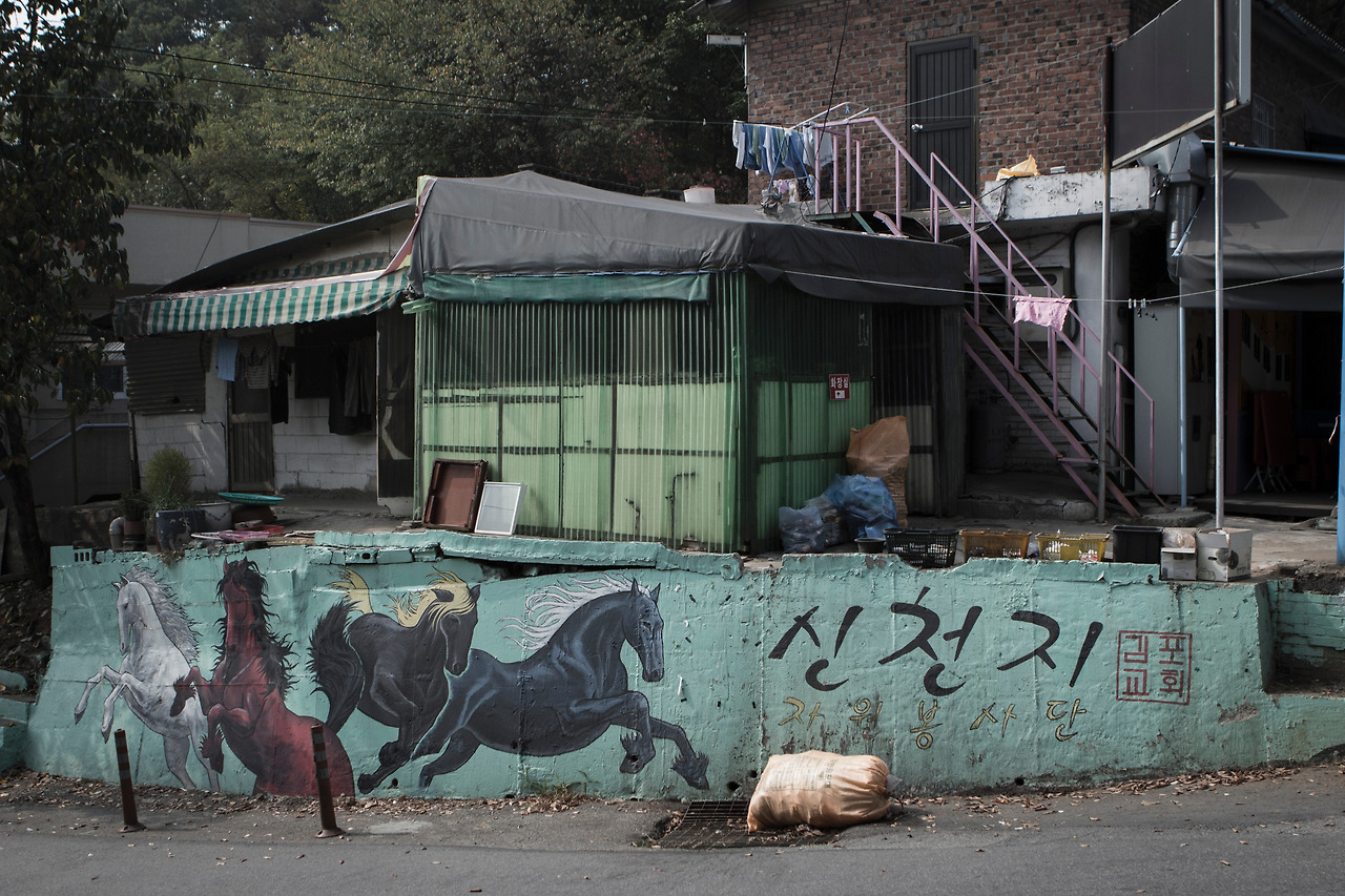 벽화가 그려진 턱 위로 녹색의 낡은 슬레이트 가건물이 보였다.