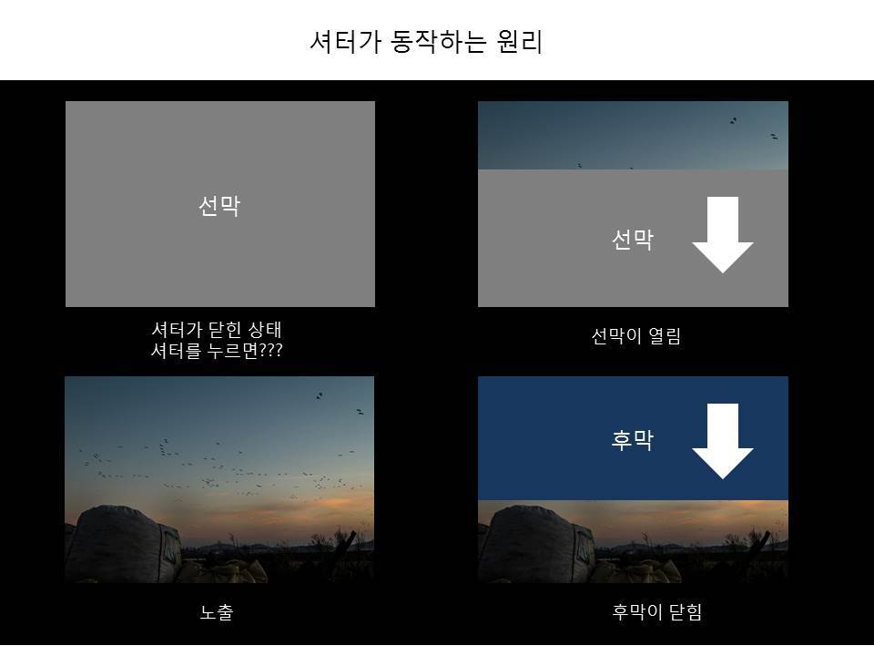 사진은 찰나의 예술이다. 그만큼 순간을 잡는데 용이하다. 이렇게 순간포착이 가능한 것은 ‘셔터’ 때문이다. '찰칵' 하는 셔터 소리는 셔터막이 열렸다 닫히는 소리다. 셔터막은 <선막>과 <후막> 2개가 부착돼 있다. 셔터를 누르면 선막이 내려가며 노출을 하고, 후막이 내려오며 다시 막는다-이 부분은 이해하기 힘들면 그냥 넘어가도 된다.
