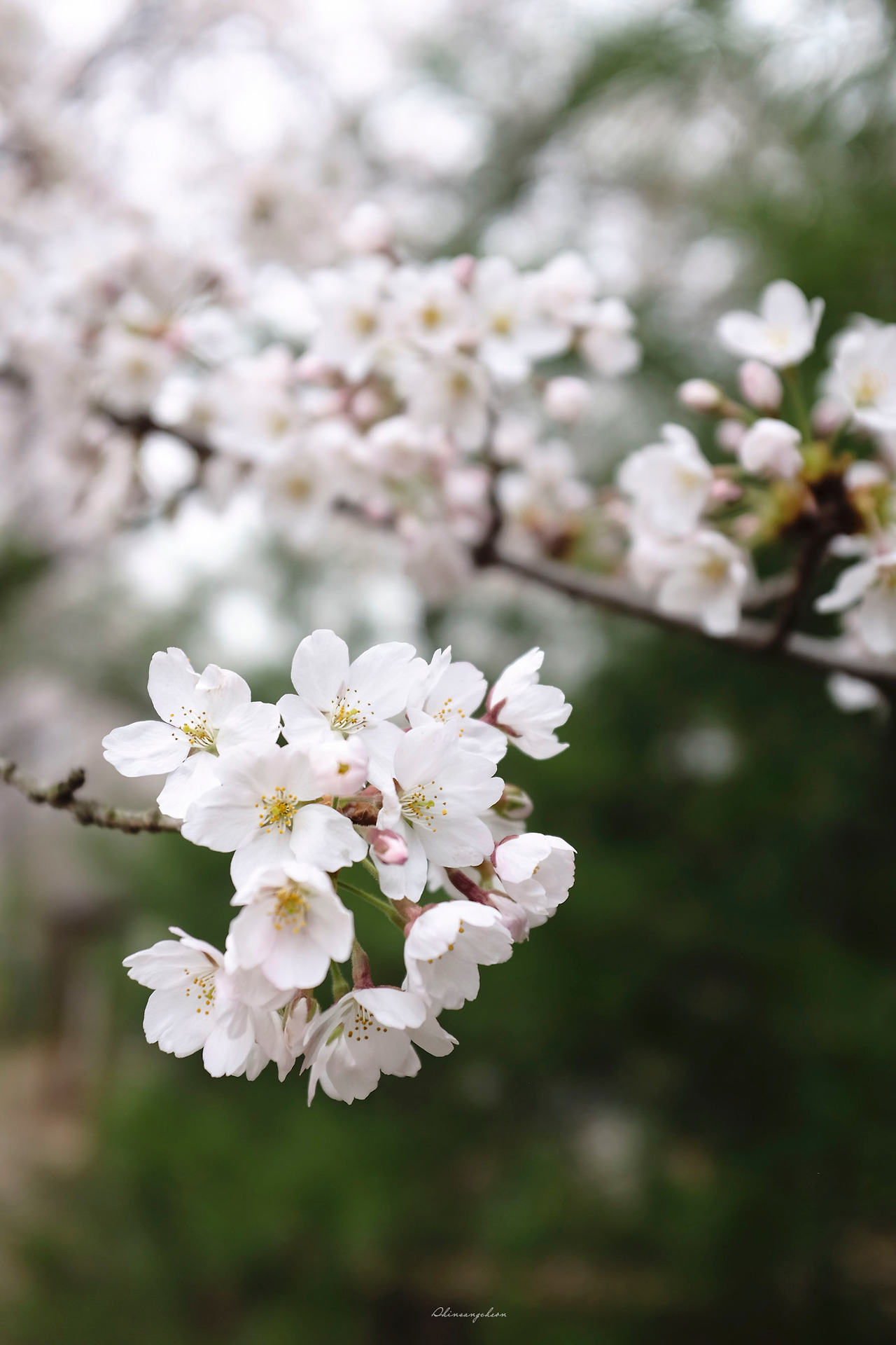 구름이 많이 낀 흐린 날이다. 덕분에 부드러운 광원이 꽃길 전체를 따뜻하게 감쌌다. 나무토막이 동개진 계단 길은 위쪽까지 끝이 없었다. 마치 하늘로 가는 계단 같았다. 레드 제플린은 stairway to heaven을 부르며 이런 계단을 상상했을까. 양 옆으로는 적당한 굵기의 벚나무들이 행렬을 하듯 나란히 줄 서 있었다. 벚나무에서 꽃들이 만발하고 만개했다. 부끄러운 듯 홍조를 띤 하얀 벚꽃들이 담백하게 피어있었다. 하늘이 보이지 않았다. 벚꽃들이 하늘을 가득 가리고 있어서기도 했지만 벚꽃들은 보는이의 시선을 놓아줄 생각이 없어보였다.