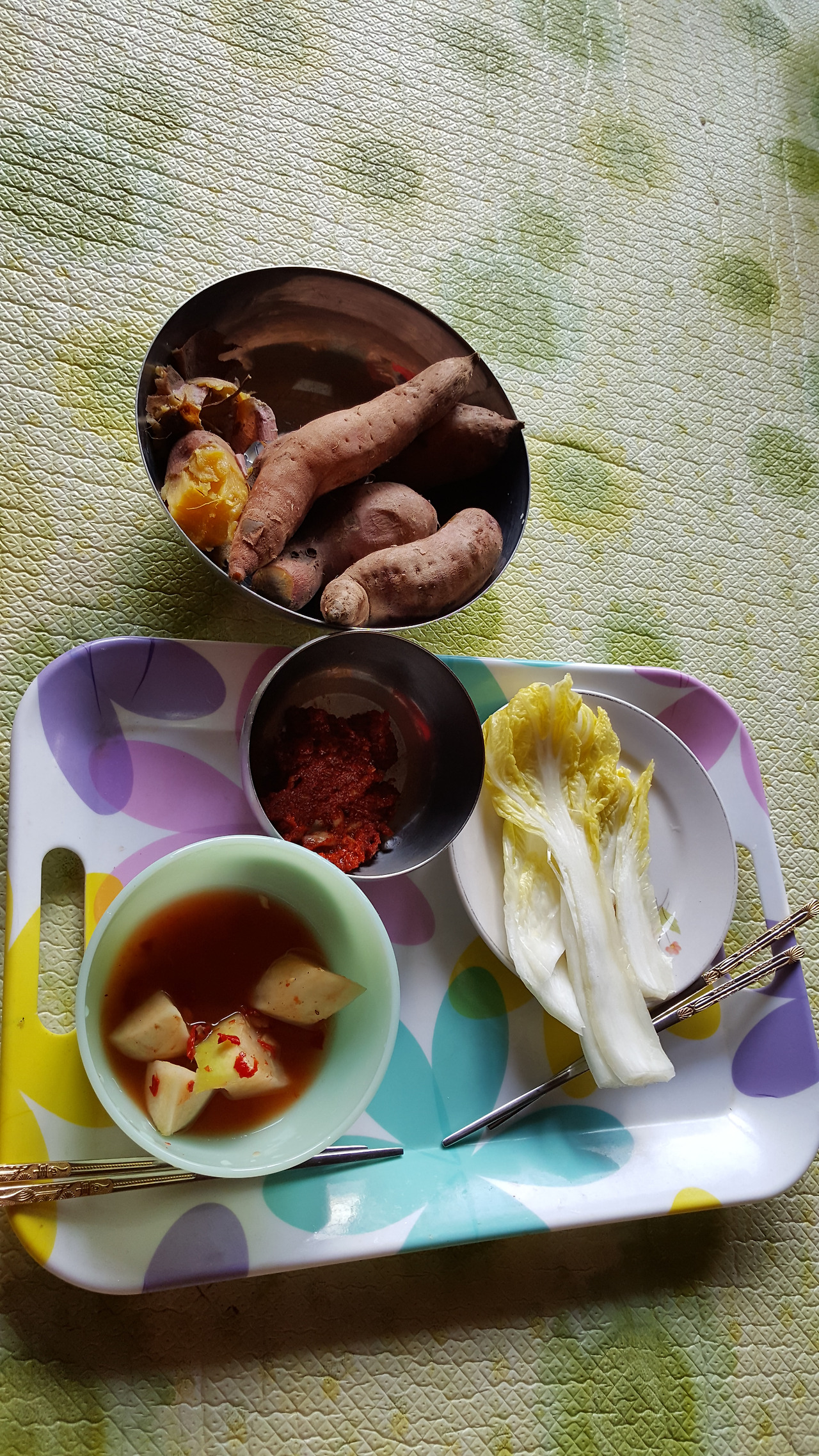 시력은 좋으나 노안이 왔다. 젠장 안경을 가져 왔으면 좋았을텐데 주머니에는 햇볕 가릴 선그라스만 쑥스러워 하며 숨어있다. 할머니랑 이런저런 얘기하며 논다. 할머니는 갓 삶은 고구마와 무김치를 주셨다. 맛있게 먹는 모습에 톳밥까지 주셔서 김치에 쓱쓱비벼 맛나게 먹었다 .
