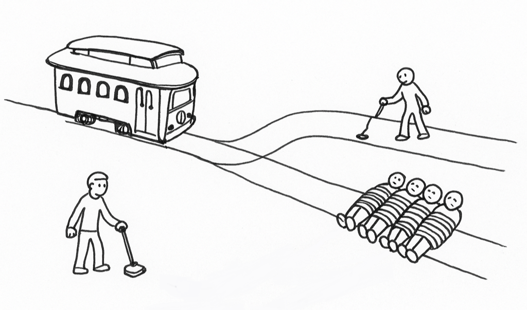 브레이크가 고장 난 열차가 달리고 있는 레일 위에 다수의 인질이 누워있을 때 이들을 살리기 위해선 레일 변환기를 사용해 트롤리 방향을 바꾸는 방법뿐입니다. 하지만 다른 레일 위에는 1명의 인부가 일하고 있다면 트롤리 방향을 바꿀 수 있는가가 주된 논쟁 사항입니다.