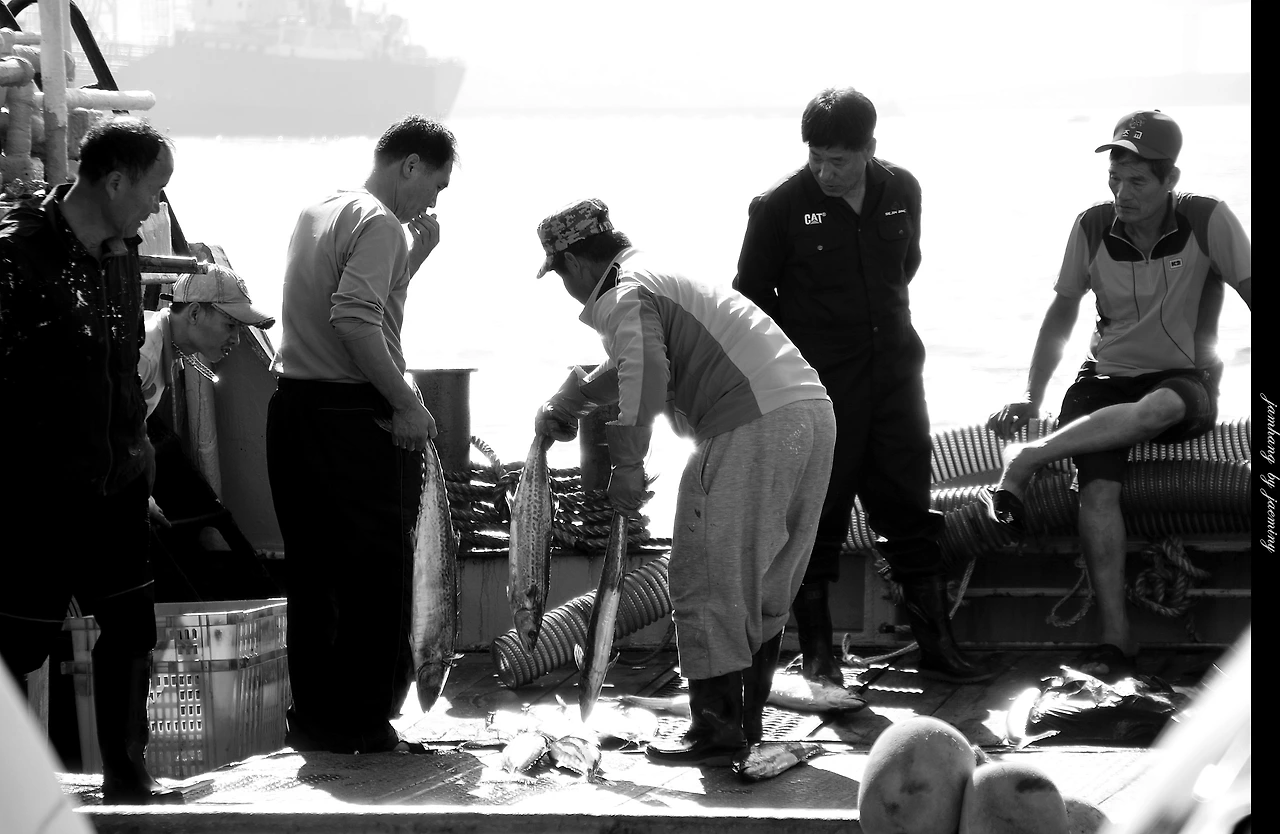 일렬로 늘어서 바다로 나갔다 들어온 어선에서 고기를 운반하는 사람..