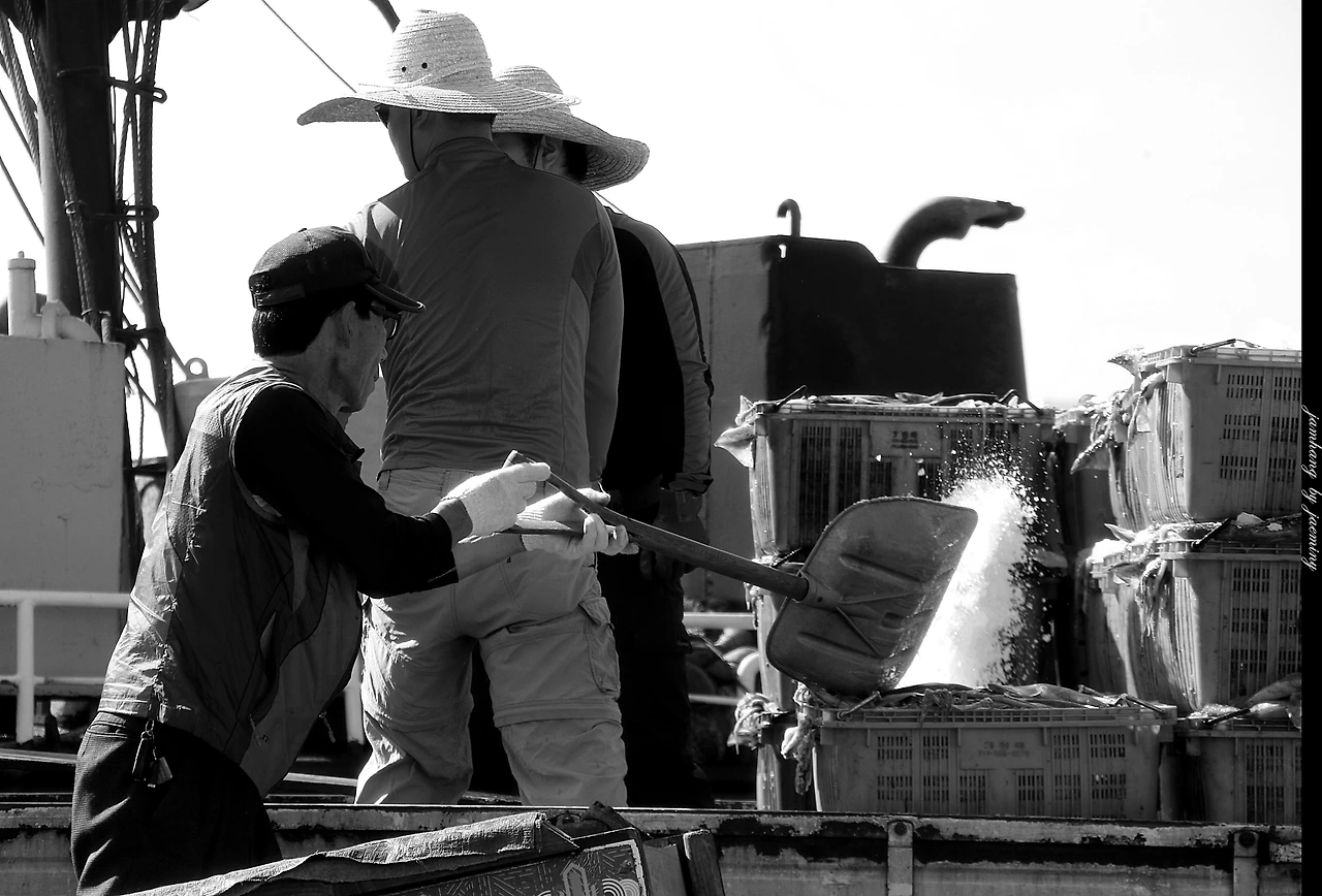물고기가 상할까 얼음을 한가득 채우는 사람..