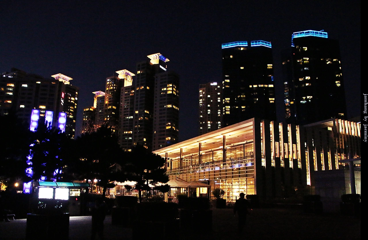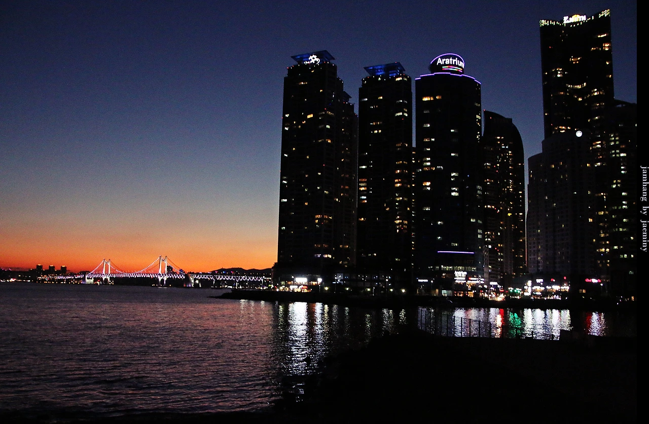 바닷가 좌우로 저녁시간 아름다운 불빛을 뿜어내는 센텀시티와..