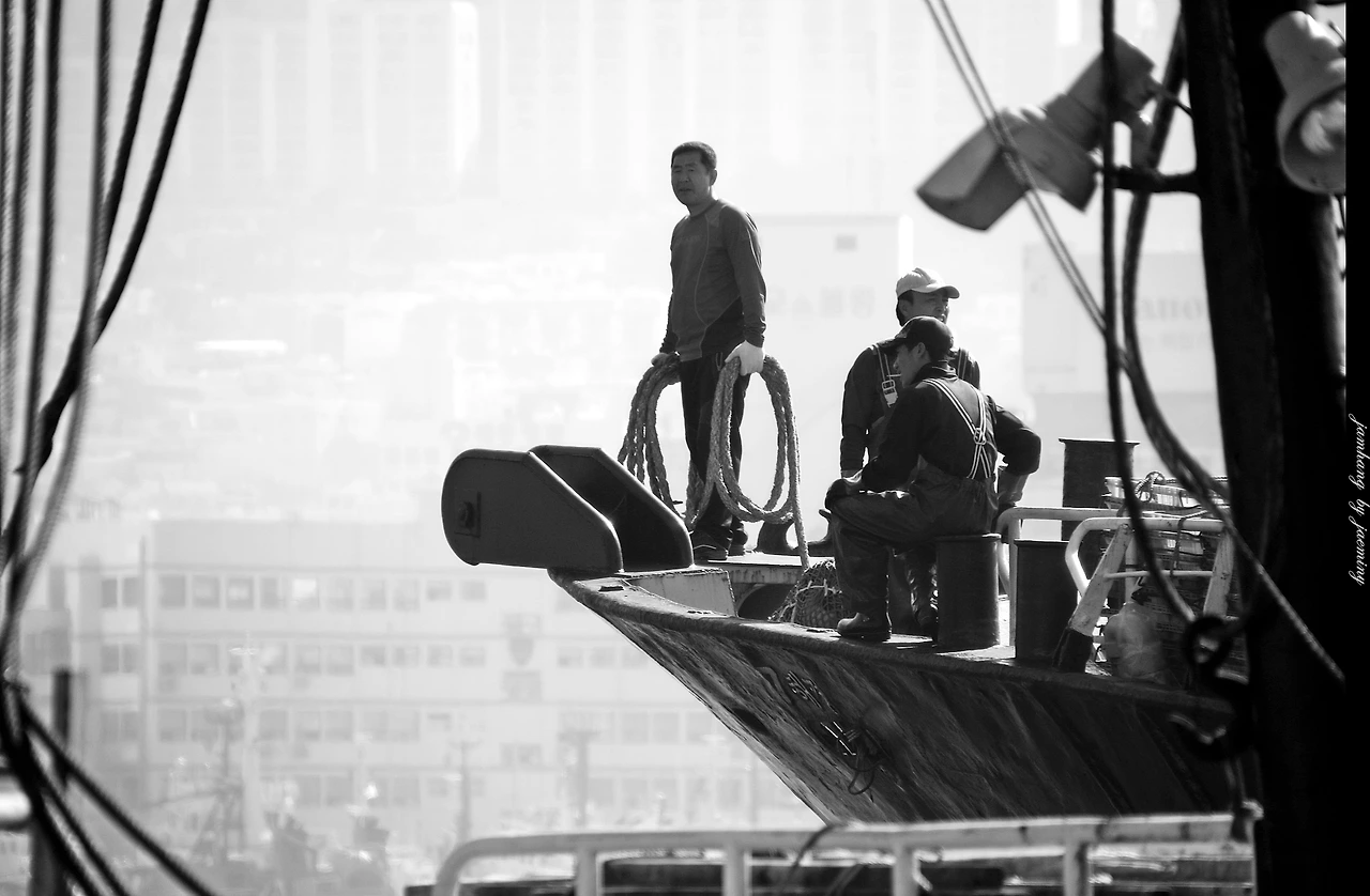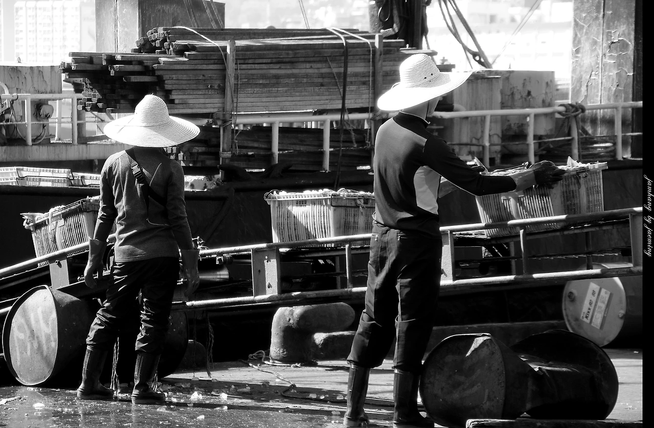 방금 갓 잡아 들여온 물고기를 내리는 위한 작업이 한창이다.