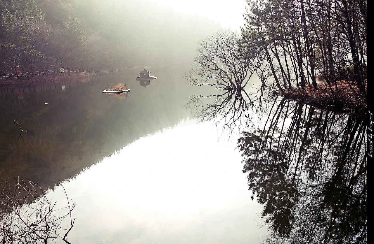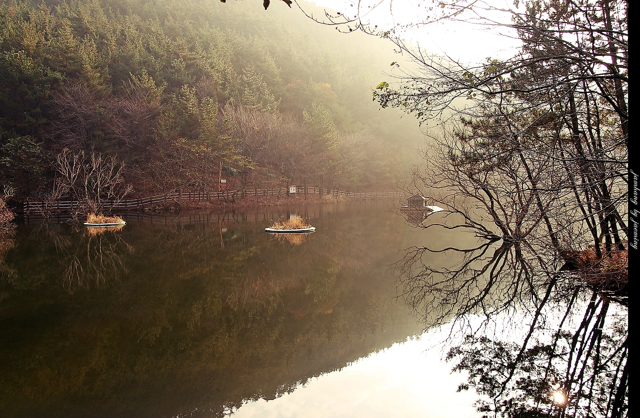 잔잔한 수면위 피어오르는 물안개의 몽환적 분위기에 이 것은 꿈이다 라는 착각을