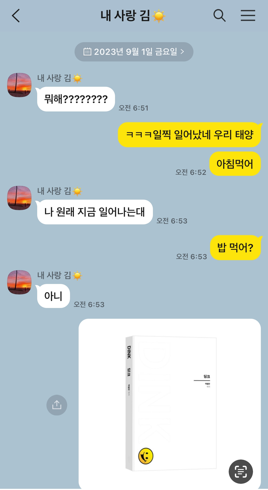 아침 일찍 조카 태양이에게 카톡이 왔다. 미소가 번졌다. 요 녀석. 고모 출간 소식을 들었나 보다. 책에는 태양이에게 쓴 첫 편지가 담겨 있어 조카가 기대만발 중이다. 정말 사랑스러운 아가.