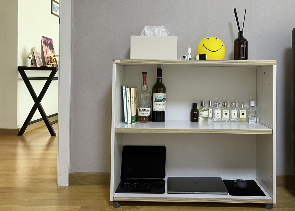 이 자리에 있던 브라운 곰돌이 스탠드는 거실로 해방시켰다. 대신 귀여운 스마일이 제일 윗 칸에서 웃고 있다. 워낙 미니멀 라이프에 익숙해 제법 큰 책장이 어색했다.