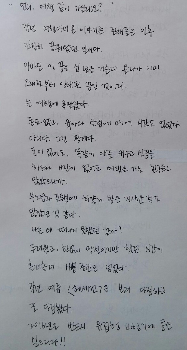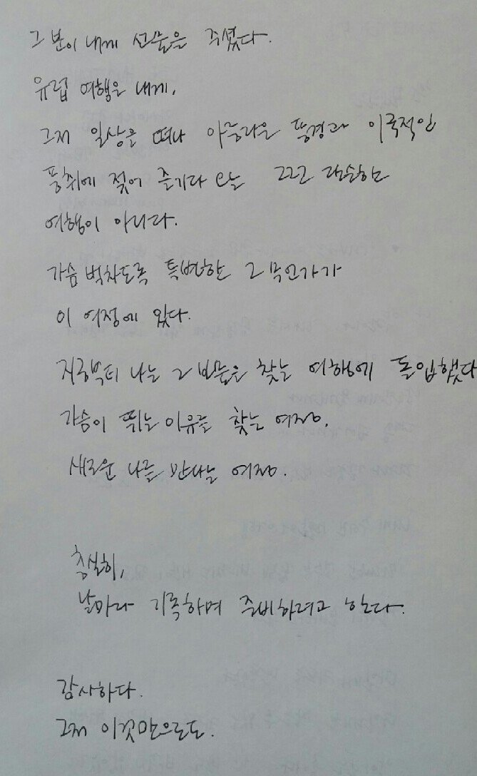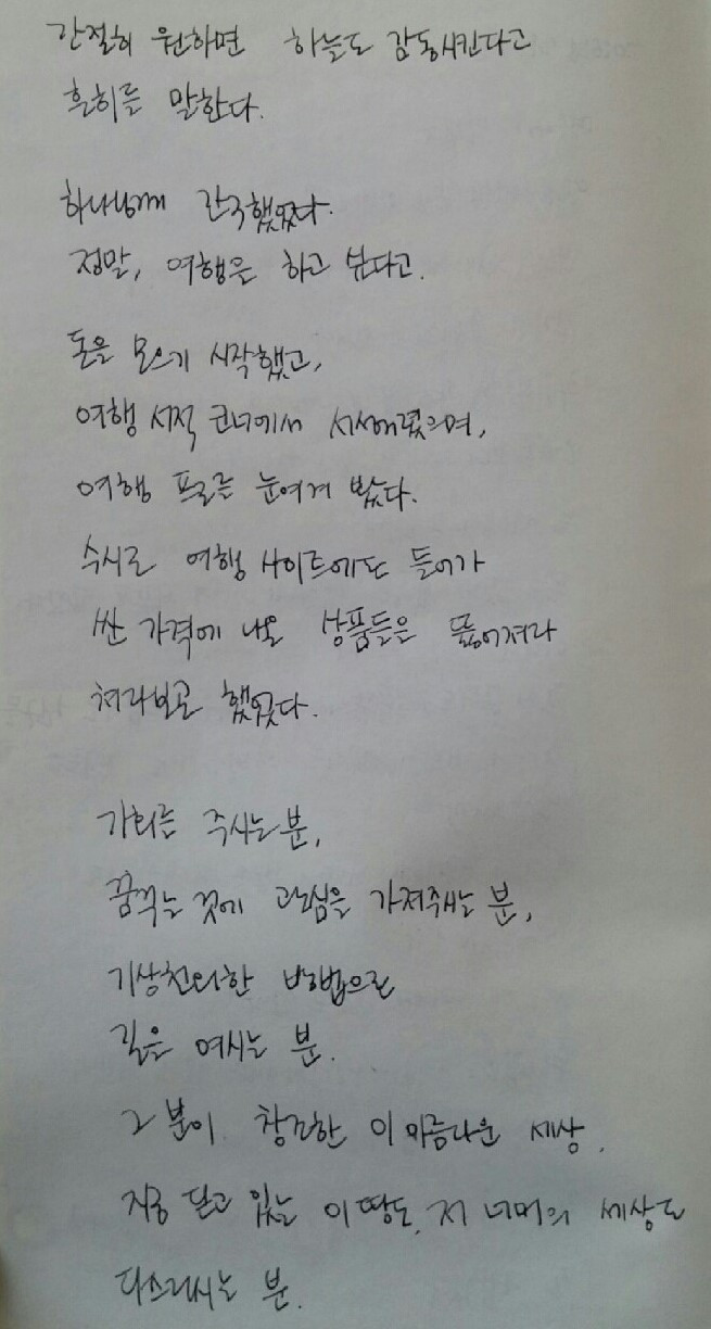 이 여행을 인솔하시는 분은 내가 한 번도 만난 적이 없다. 서로 문자를 통해 인사를 나누고 내 블로그를 소개해드렸다. 오늘 아침 그분의 '카카오 스토리'에 올라온 글을 보고 결국 눈물을 흘리고 말았다. 나의 꿈은 우연히 이뤄지는 것도 아니고, 내 의지와 노력만으로 되는 것이 아님을 알았기 때문이다.