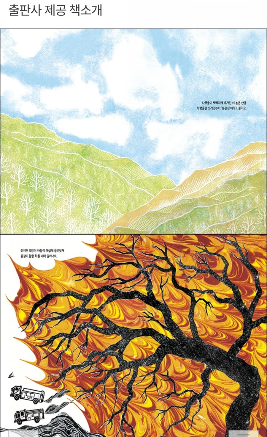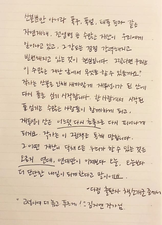 마블링으로 표현한 산불 장면은 뜨겁고 아프게 다가온다. '와, 소방관이다' 함성을 지르고, 모두가 두 손 꼭 잡고 힘을 합쳐 불길을 잡지만 '자꾸자꾸 눈물이 나요'라는 글귀에 자꾸 작가님의 얼굴이 겹쳐졌다.그림책 속에는 나무를 꼭 끌어안는 마음이 들어 있다. 초록 풀을 소중히 보듬어 안은 아이가 전하는 희망이 있다. 마지막 장면에서 나는 다시 피어나는 산, '높은성'에 초대받았다.