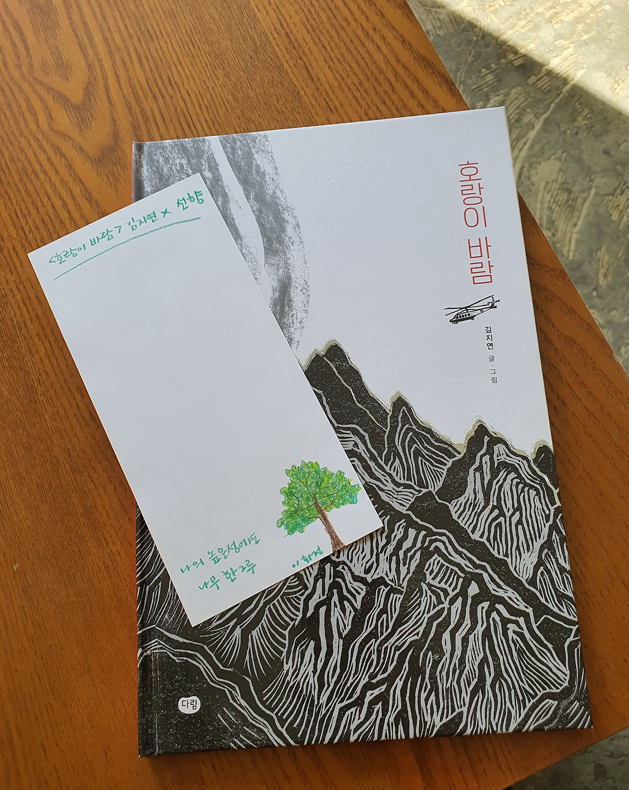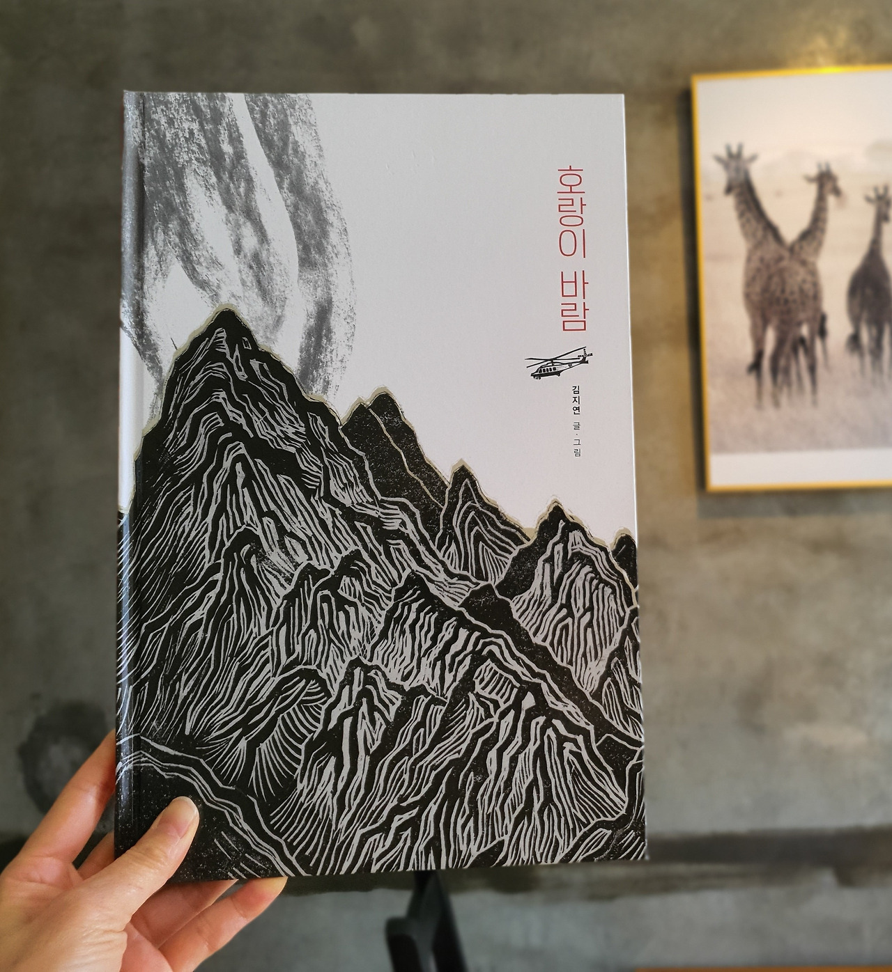 그 거대한 참사와 재난 앞에 선 작가의 시선은 무얼 향하고 있었을까. 작은 불꽃 스케치에서 시작된 이야기는 고성을 집어삼킨 큰바람, '호랑이 바람'을 판화와, 마블링 기법, 목탄화로 구현한다. 매 작품마다 판화 기법을 달리하며 지속적인 성장을 위해 노력한다는 김지연 작가님은 6개월 동안 터키 문화원에서 마블링 기법을 배우며 끔찍했던 불을 어떻게 표현할 것인가를 고심했다고 한다. 기존의 그림책들은 현실을 회피하며 불편한 이야기들을 꺼려했다면 이제는 타인의 고통을 어떻게 승화시켜 전할 수 있을까 하는 고민이 고스란히 담겨 있는 책이 <호랑이 바람>이다.