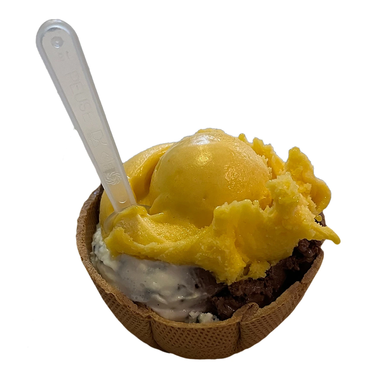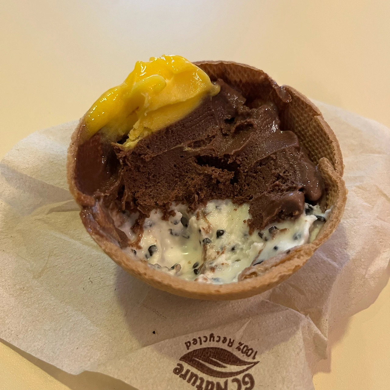 먼저 오른쪽에서 젤라또 이용권을 결제했다. 스쿱 개수에 비례하여 가격을 지불하고, 왼쪽의 매대에 가서 무슨 맛을 먹을지 이야기하면 되었다. 메뉴판을 보는 시간을 가진 뒤, 나는 ❶망고, ❷초코, 그리고 ❸마라분타(marabunta) 맛을 주문했다. 마라분타는 브라질어로 '군대개미'를 뜻하는데, 여기서는 작은 다크 초콜릿 너겟이 콕콕 박혀있는 크림 맛을 지칭한다. 찾아보면서 초코칩을 개미에 비유한 게 꽤 귀엽다고 생각했다!
