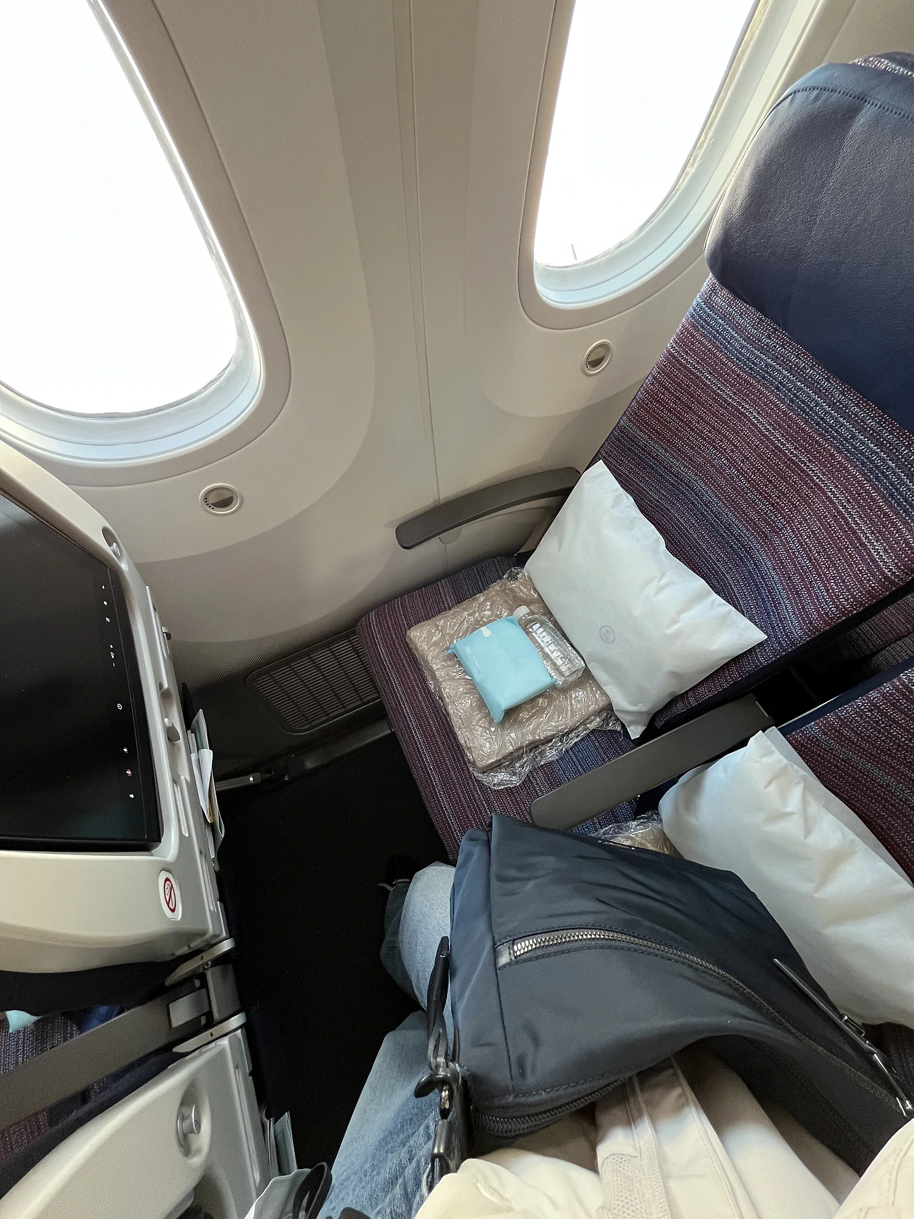 표 검사를 마치고 비행기를 타러 갔다. 탑승교를 지나 비행기 출입문으로 걸어갔다. 기체에 들어가기 전에 항공사 측에서 비치해 둔 유선 이어폰 증정품을 하나 들고 갔다. 승무원 님의 자리 안내를 받은 후, 좌석 바로 위 짐칸에 배낭을 올려놓았다.