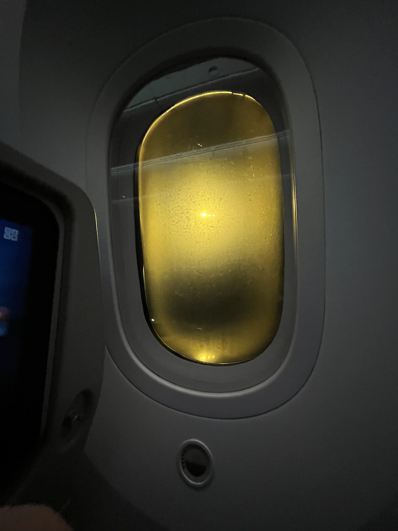 자리에 앉아서 좌석 구경을 했다. 의자 위에 놓인 담요 비닐도 야무지게 뜯어주고, 물도 마셨다. 그리고 비행기 창문도 구경했다. 정말 신기하게도 이제 더 이상 비행기 창문을 열고 닫을 수 없었다. 대신, 하단에 있는 동그란 버튼을 누르면 창문 색깔이 자동으로 어두워졌다. 단, 예전에 탔던 비행기에선 특정 시간대(객실 내부가 모두 어두워진 시간)에는 창문을 열지 못하게 했던 것처럼, 조명도 특정 시간대에는 조정할 수 없게 되어 있었다.