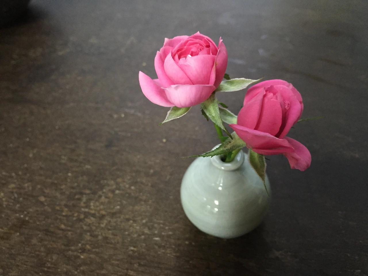 오년 동안 키우고 있는 미니장미입니다. 겨울을 나도록 내버려 두었더니, 이제는 단단하게 여물어, 봄 가을로 향이 짙은 꽃을 선 보입니다. 그 중 두 송이를 손가락 두 마디 만한 화병에 꽂아서 다락당으로 들였습니다. 봉오리로 맺혀 있는 두 송이는 며칠 후 오실 손님을 위해 남겨두고요. 이 앙증맞은 다화를 녹차 전용 차호와 찻잔 곁에 두니, 오늘의 찻자리가 완성되었습니다.