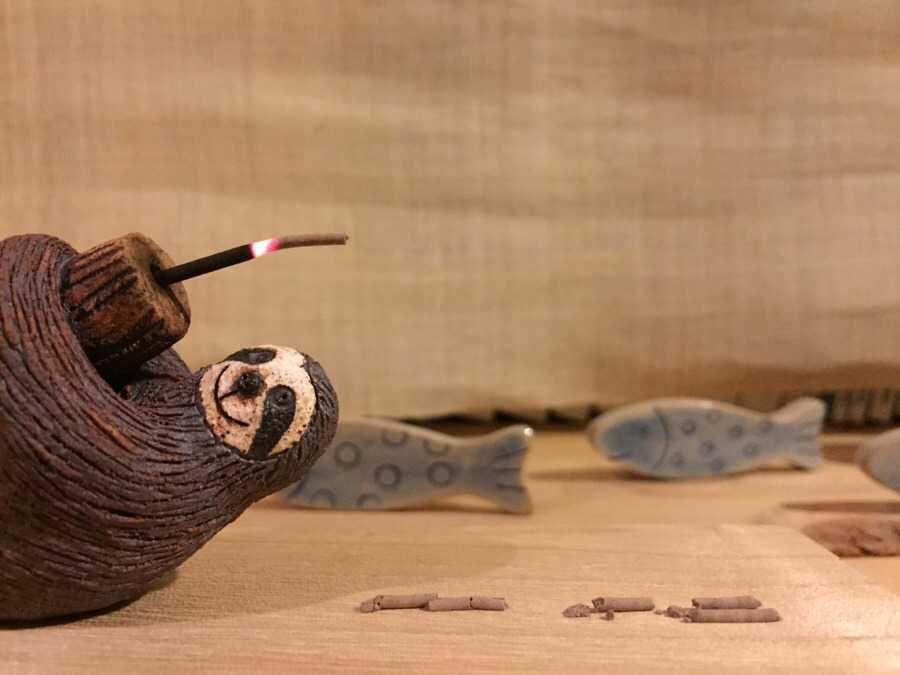 나무늘보 토우는 언제나 만면에 미소를 띠고 다락당을 지킨다. 그 늘보에게 익산의 차벗이 나누어주신 조합향을 반 대만 안겼다. 물고기가 지나는 와중에 나무늘보는 드러누워 향을 보듬는다. 꽃꽂이로 태어났으나 향꽂이가 되었다. 꽃이든 향이든 향기를 안고 사는 삶이니, 즐거운 일이다. 내 앞에 향기 머금은 이가 함께 살고 있으니, 나도 늘보처럼 복 받은 삶일 테고...