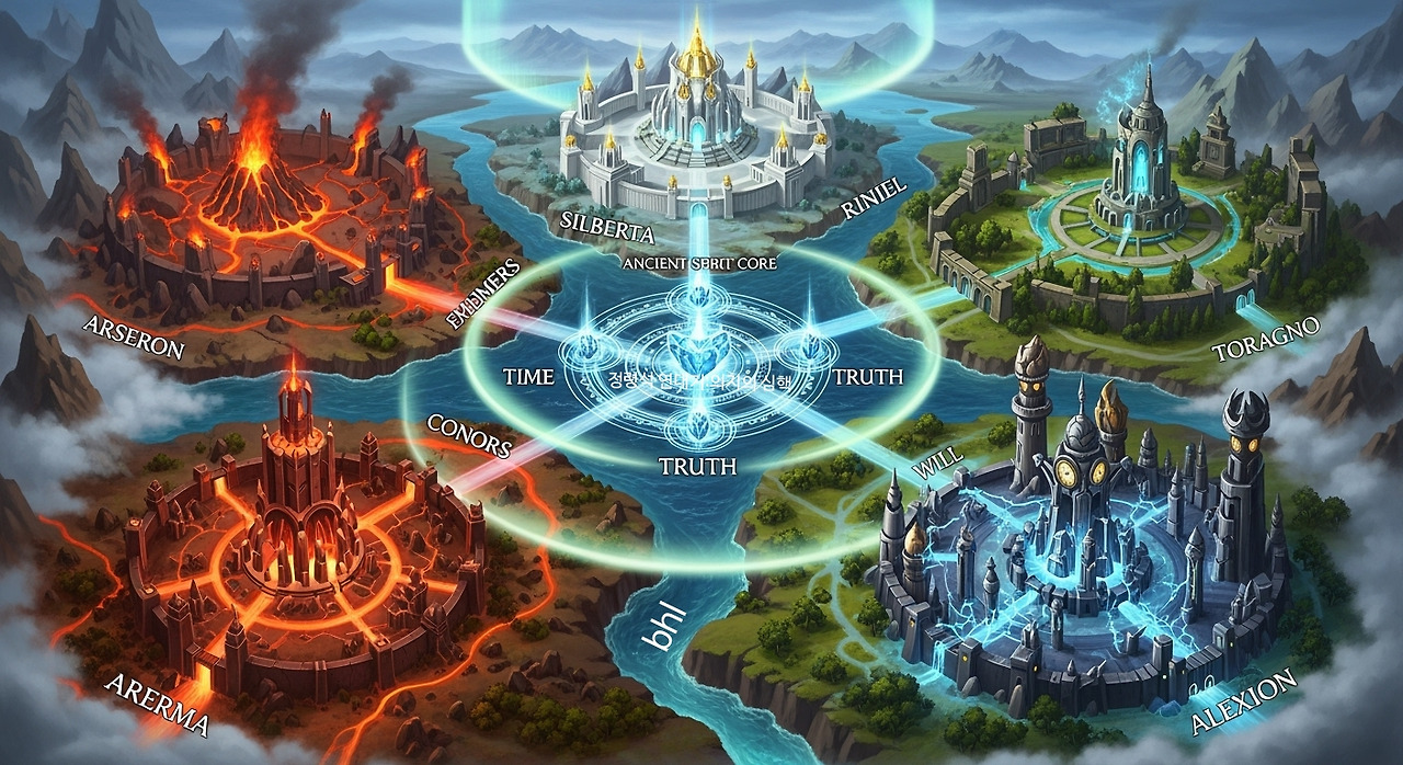 •알렉시온: 기계와 시간의 청동 도시중앙의 고대 정령석에서 다섯 심핵(시간, 기억, 진실, 의지, 현현)의 마법적 에너지가 각 왕국을 연결